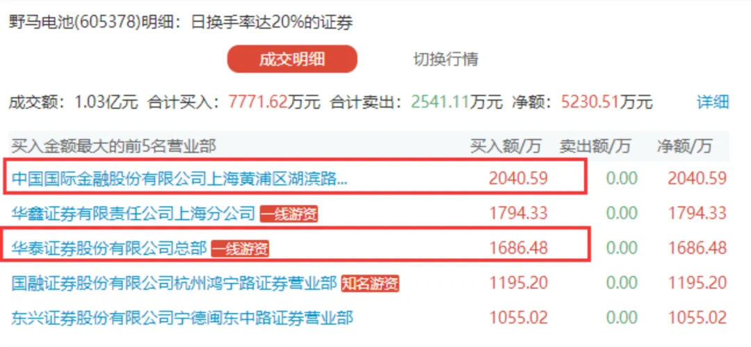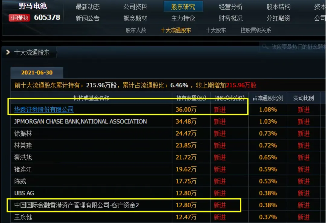 虎榜买三的华泰总部(按6月30日当日股价45.94元)对应的是买入36万股,查阅下野马电池的中报,对应就是十大流通的股东第一的华泰证券股份有限公司