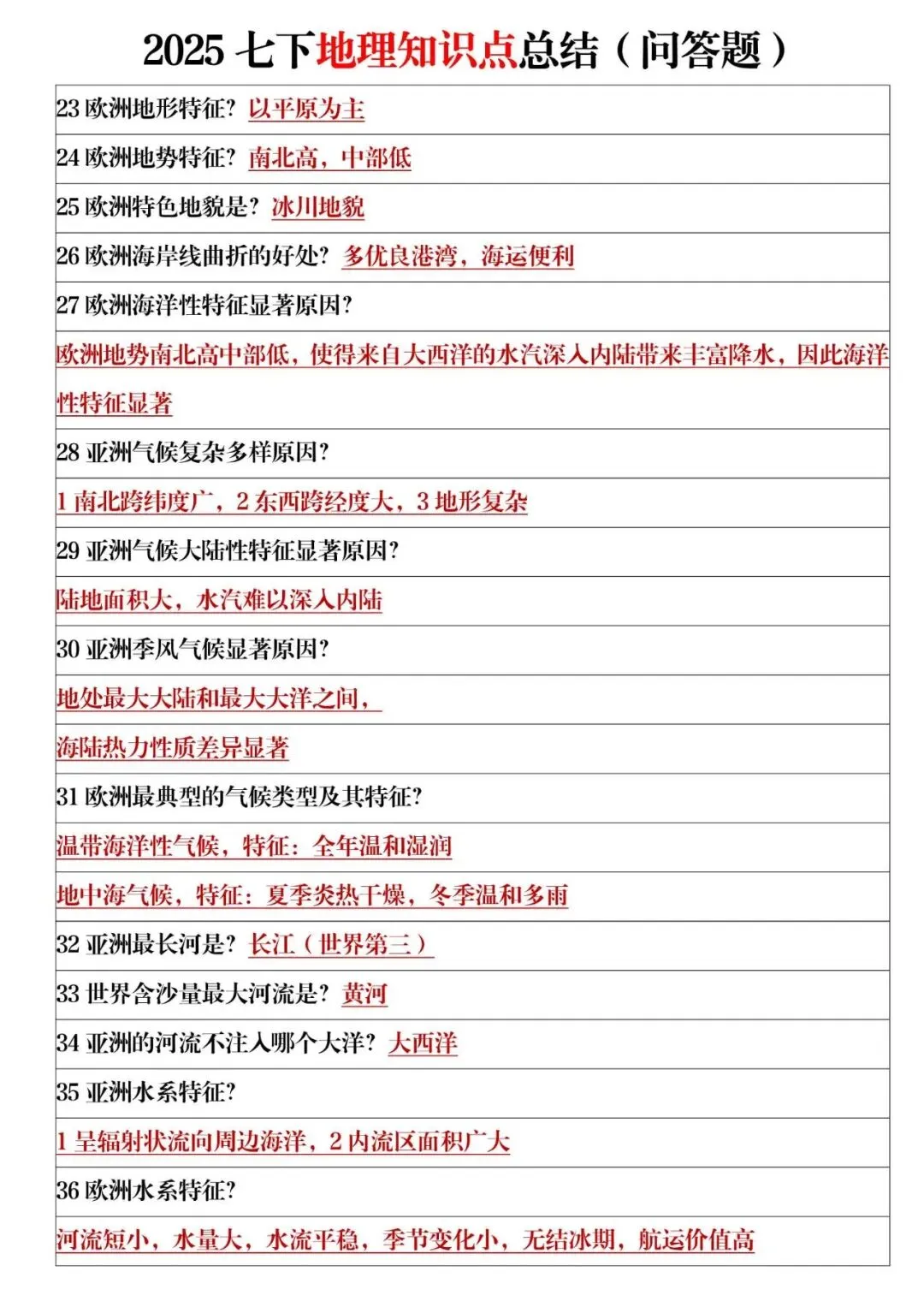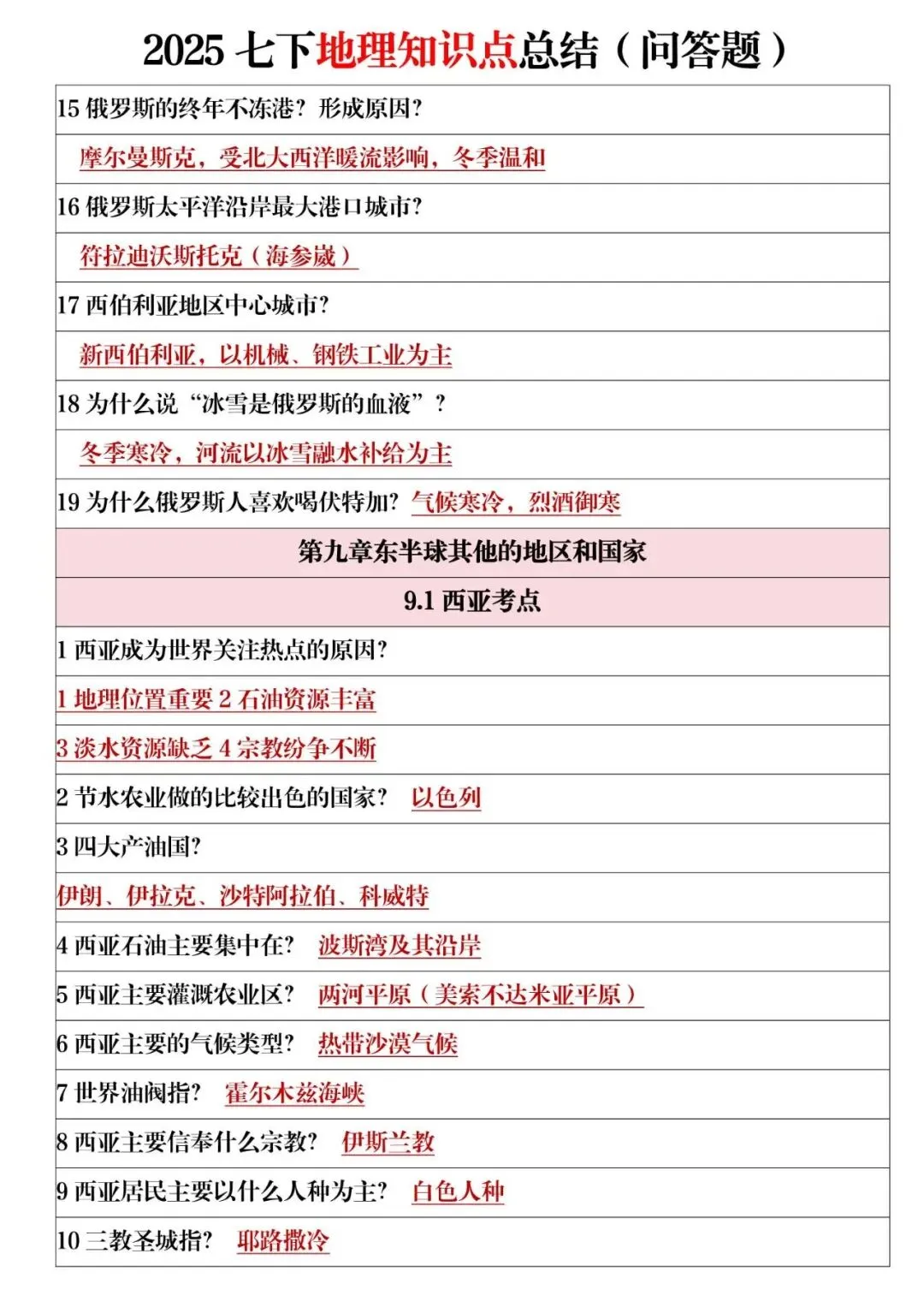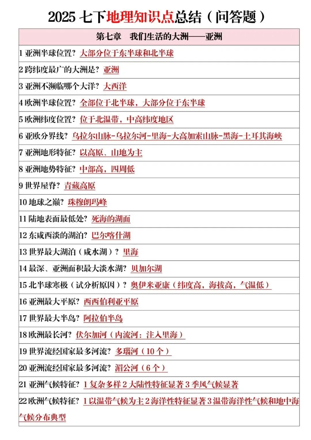 今天老师给大家整理了:地理提分神器!七下知识点问答题总结,从亚洲到极地地区,电子版可打印!