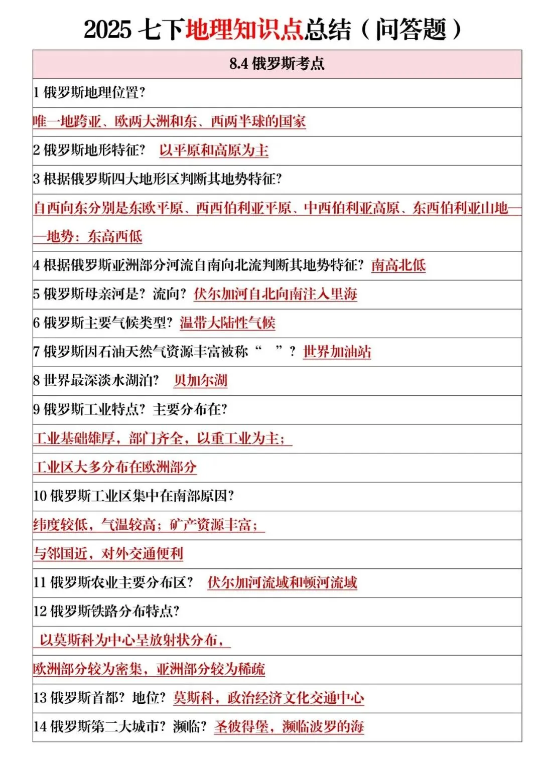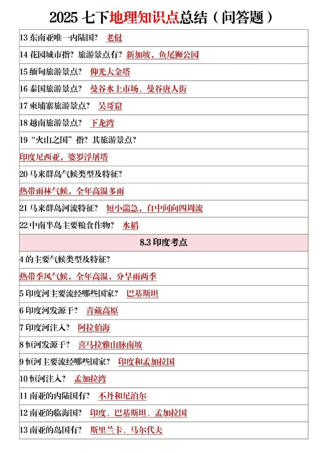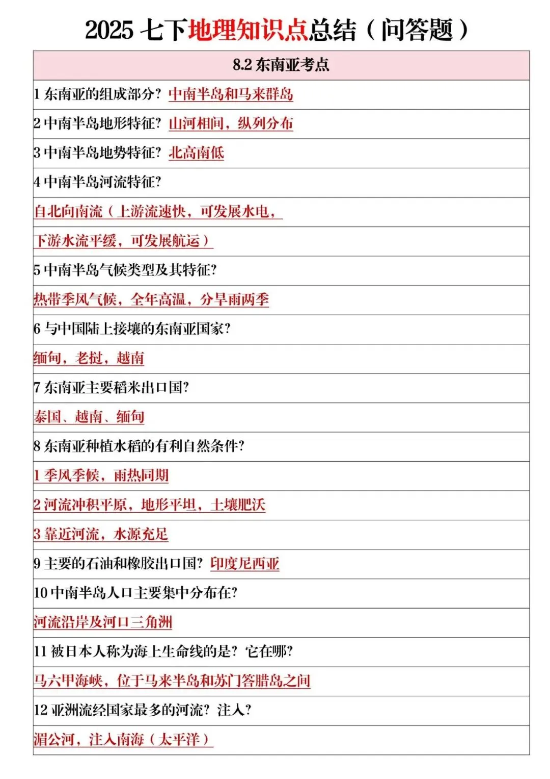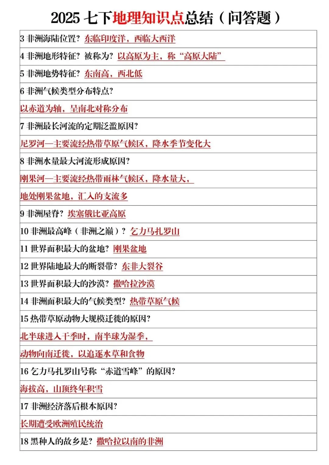 今天老师给大家整理了:地理提分神器!七下知识点问答题总结,从亚洲到极地地区,电子版可打印!