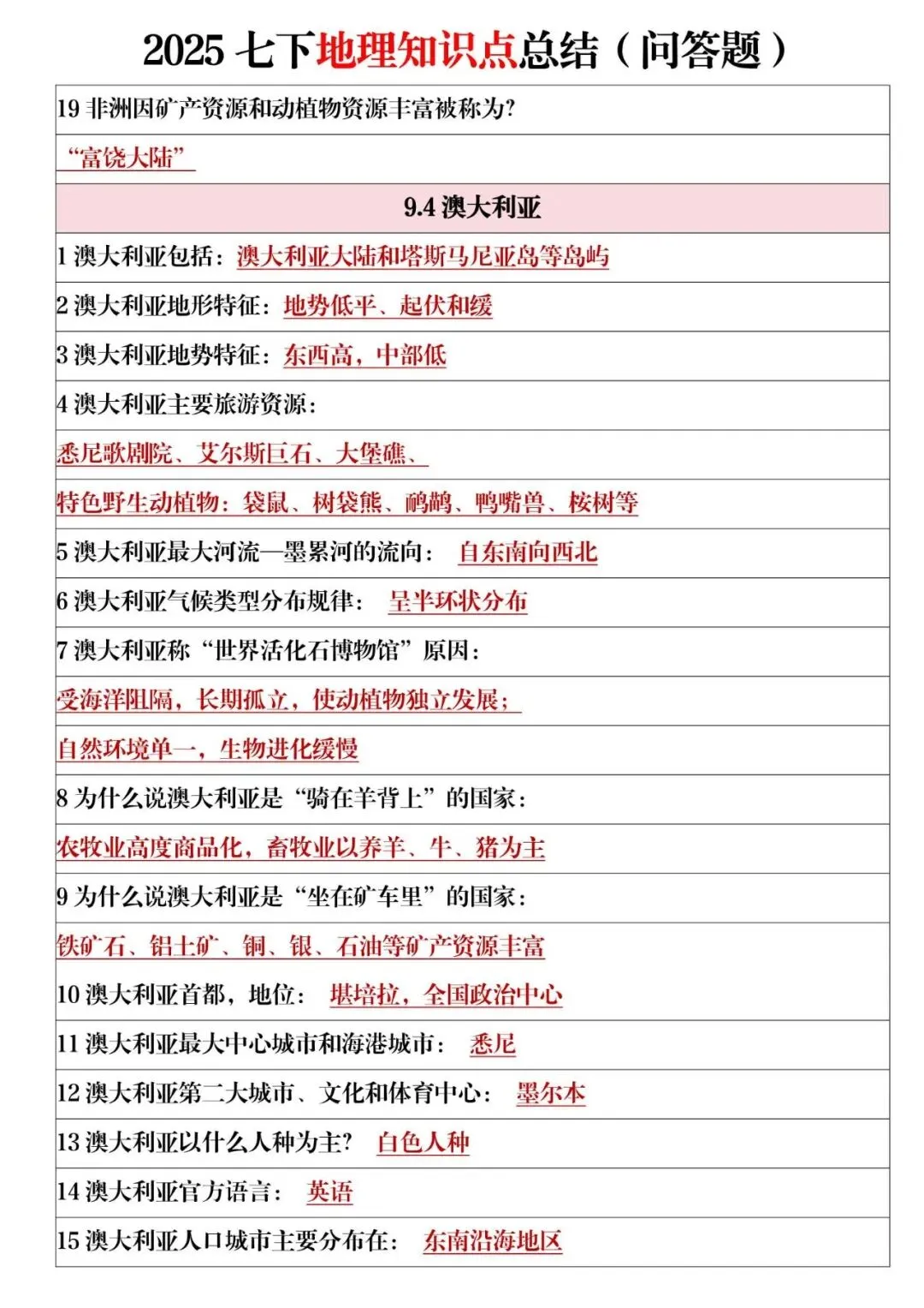 地理提分神器!七下知识点问答题总结,从亚洲到极地地区,电子版可打印!