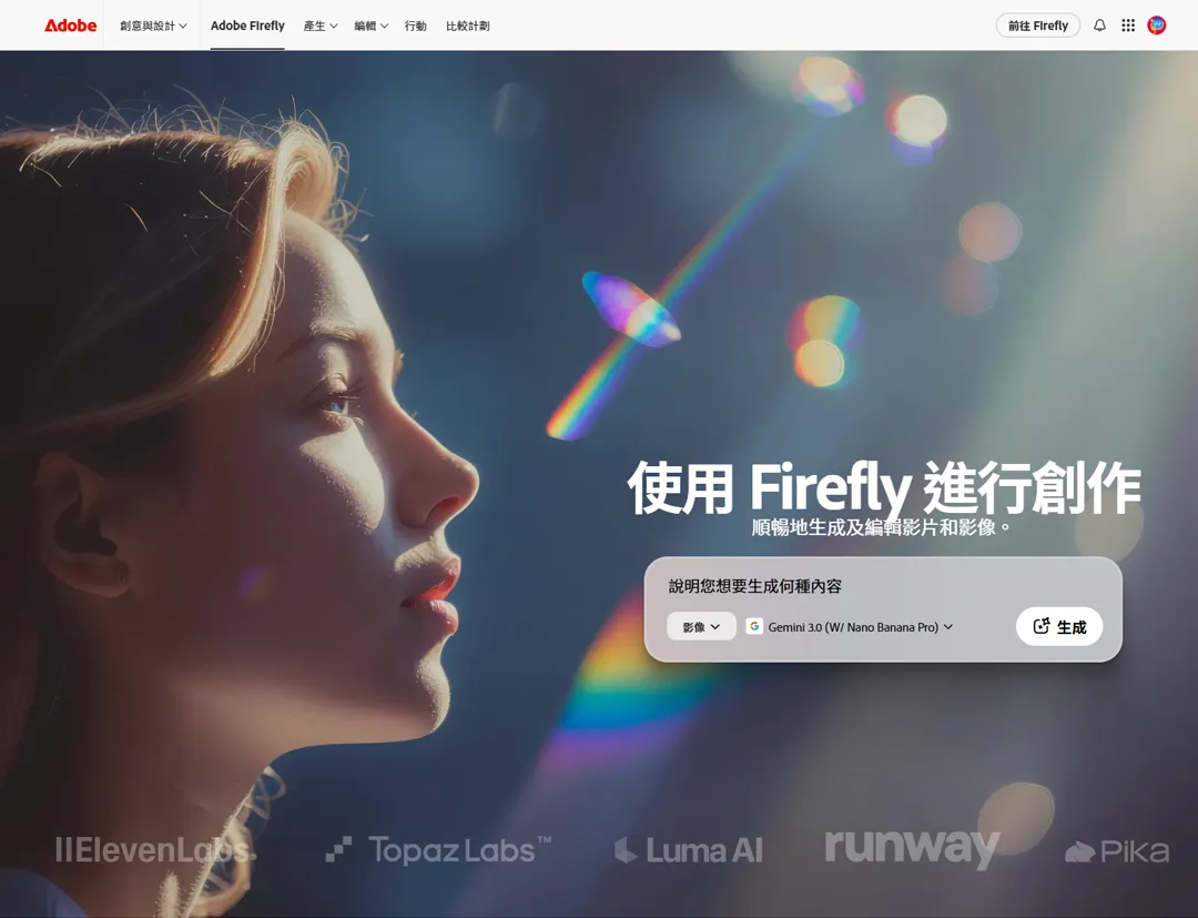 Adobe Firefly,如果你本来就用 Creative Cloud,这个最顺手,跟 Photoshop、Illustrator 无缝衔接。