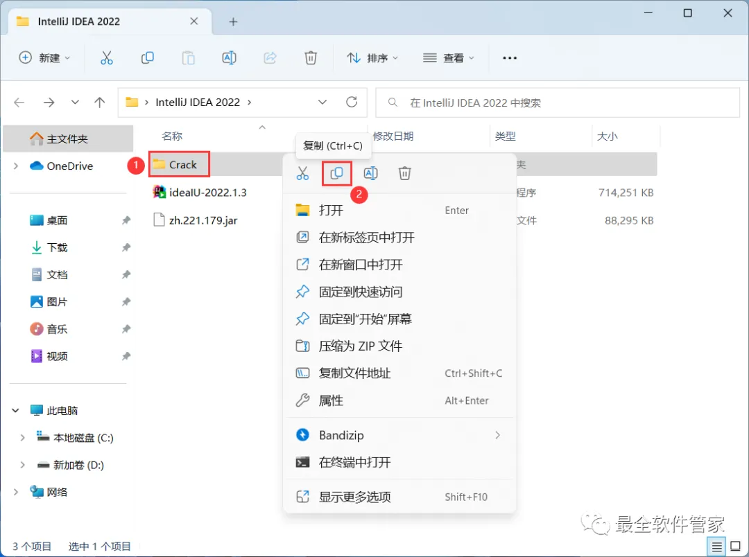 10、回到IntelliJ IDEA 2022文件夹,找到【Crack】文件夹,右键点击【复制按钮】