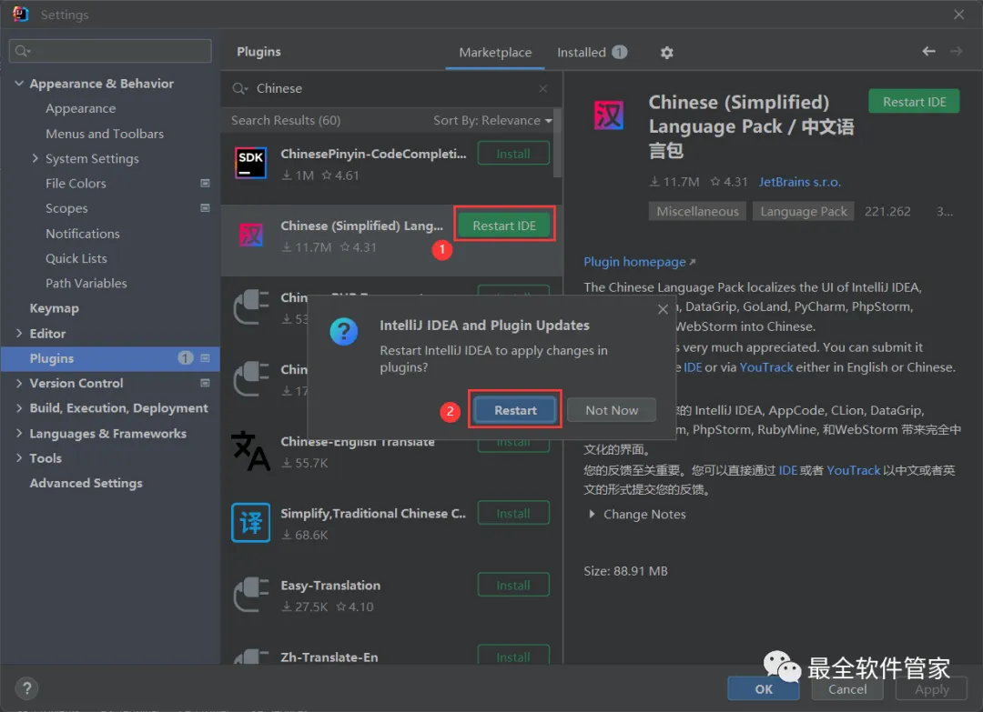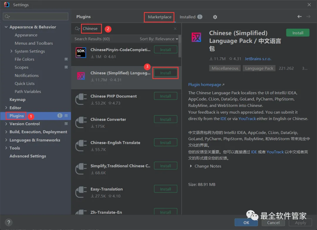 22、点击左侧的【Pluguns】,再在搜索框内输入【Chinese】,找到【Chinese(Simplified)】,点击【Install】