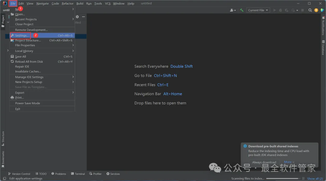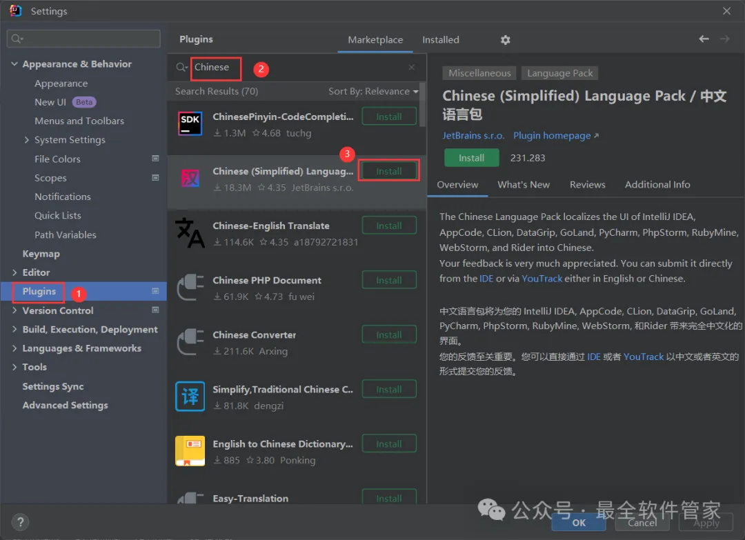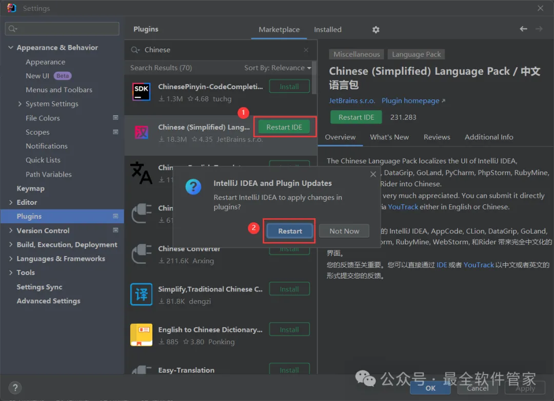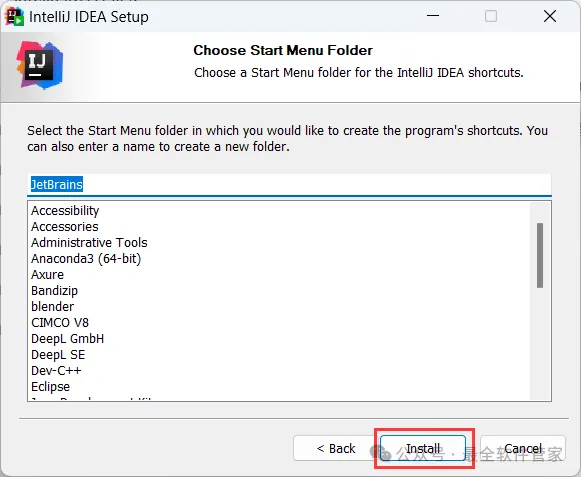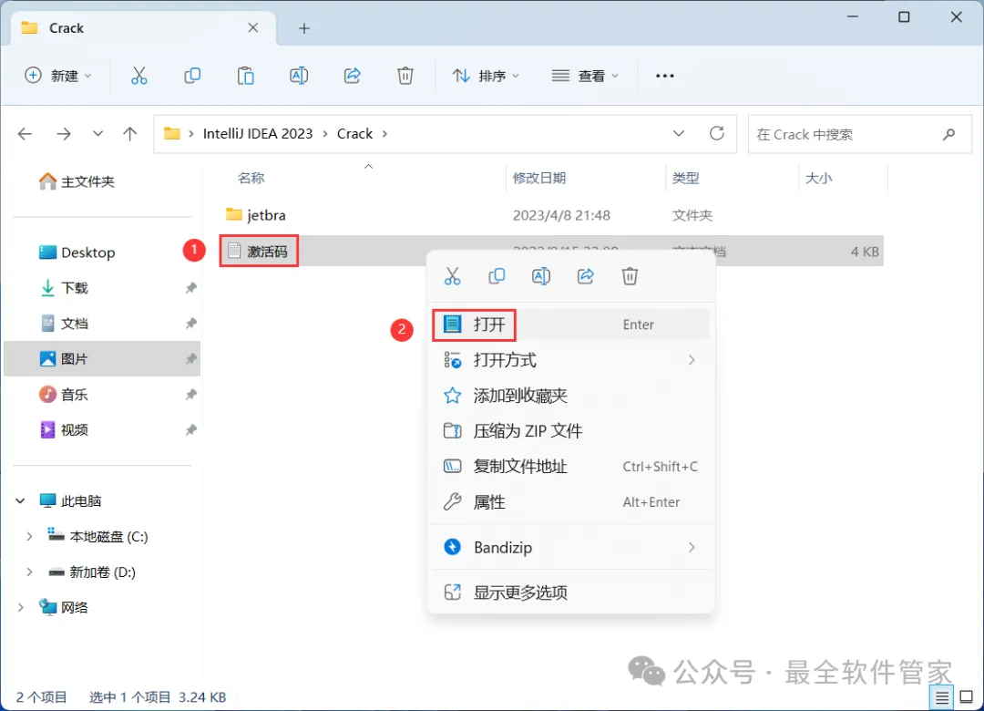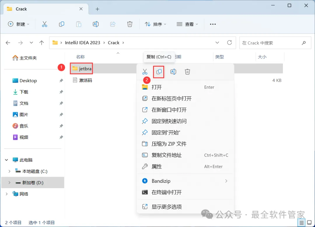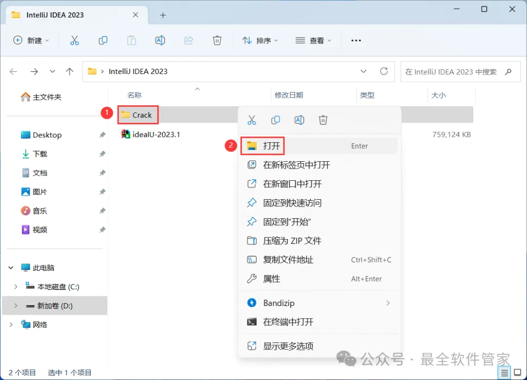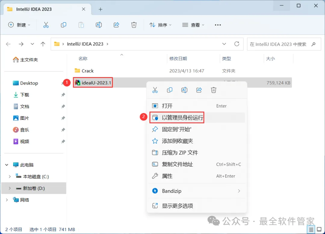 安装需知[软件名称]:IntelliJ IDEA 2022[软件大小]:742MB[软件语言]:中文简体[安装环境]:Win7及以上版本[下载地址]:公众号内回复:IDEA[不限速下载]:免费获取百度网盘不限速下载工具。公众号内回复:不限速[注意事项]:安装前请关闭网络、杀毒软件和防火墙,否则易安装失败。公众号内回复:1[解压软件]:小编用的解压软件是Bandizip,获取Bandizip软件安装包。公众号内回复:2安装教程1、下载IntelliJ IDEA 2023软件安装包到电脑上,右键选择【解压到IntelliJ IDEA 2023\】2、右键【打开】解压后的文件夹 3、找到【ideaIU-2023.1】应用程序,右键选择【以管理员身份运行】它4、点击【Next】 5、软件默认安装在C盘,可自定义更改软件安装位置,这里小编选择安装在D盘;点击【Next】 6、全部都勾选上,再点击【Next】 7、点击【Install】 8、软件安装中,稍等片刻 9、点击【Finish】 10、回到IntelliJ IDEA 2023文件夹,找到【Crack】文件夹,右键【打开】它11、找到【jetbra】文件夹,右键点击【复制按钮】12、打开本地C盘,再右键文件夹的空白处,点击【粘贴按钮】13、找到粘贴的【jetbra】文件夹,右键【打开】它14、找到【scripts】文件夹,右键【打开】它15、找到【install-current-users】程序,右键【打开】它16、点击【确定】17、点击【确定】 18、回到桌面,右键桌面上的【IntelliJ IDEA 2023.1软件图标】,点击【打开】19、点击【OK】 20、点击【Don`t Send】21、点击【Activation code】 22、回到Crack文件夹,找到【激活码】文件,右键【打开】它23、右键点击【复制】全部内容 24、回到软件界面,右键Activation code下的空白处,点击【Paste】25、点击【Activate】 26、点击【Continue】27、点击【New Project按钮】 28、点击【Create】 29、依次点击【File】、【Settings…】30、点击【Plugins】,在搜索框输入【Chinese】,找到【Chinese(Simplified)…】程序,再点击【Install】 31、安装结束后,点击【Restar IDE】,再点击【Restart】32、软件正在打开,启动界面如下: 33、软件打开成功,运行界面如下:34、以上就是IntelliJ IDEA 2023软件安装的全过程,要是对你有帮助的话,请为小编点个赞! 免责声明:软件资源均来源于网络,仅供用户交流学习与研究使用,版权归属原版权方所有,版权争议与本公众号无关,用户本人下载后不能用作商业或非法用途,否则后果均由用户承担责任;如果您访问和下载此文件,表示您同意只将此软件用于参考、学习而非其他用途,否则一切后果请您自行承担,请于下载后24小时内删除,不允许用于商业用途,否则法律问题自行承担。如果您喜欢该软件,请支持正版软件,购买注册,得到更好的正版服务。