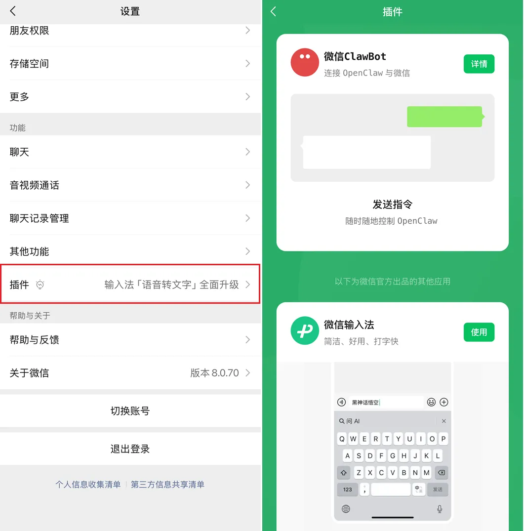 大家在微信的“设置” -“插件”就可以看到新增的“微信 ClawBot”插件。目前这一功能在 iOS 微信 8.0.70 正式版大范围上线,没有这一功能的小伙伴,可将微信升级最新版本,并将微信从后台退出后再重新查看。