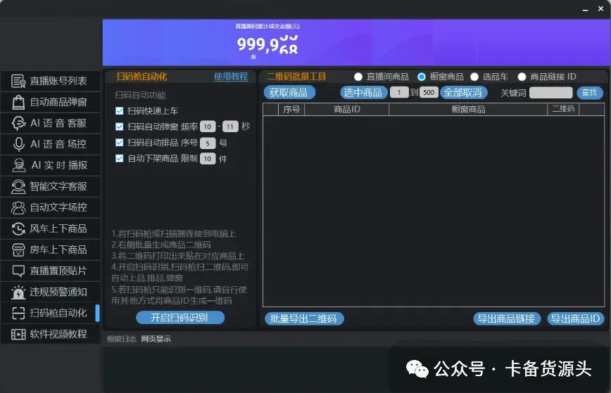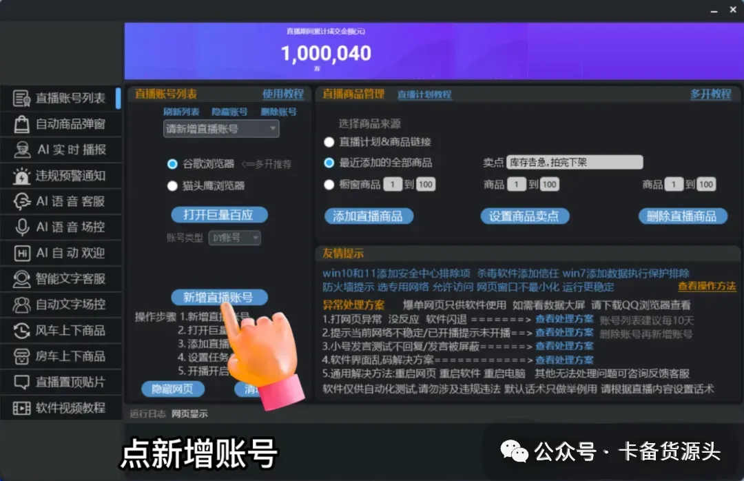登录后,点击“新增直播账号”,弹出扫码窗口。用手机APP扫码即可自动添加,然后点击“打开巨量百应”,进入直播中控后台。