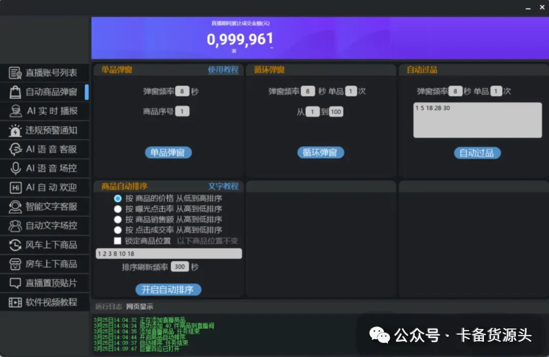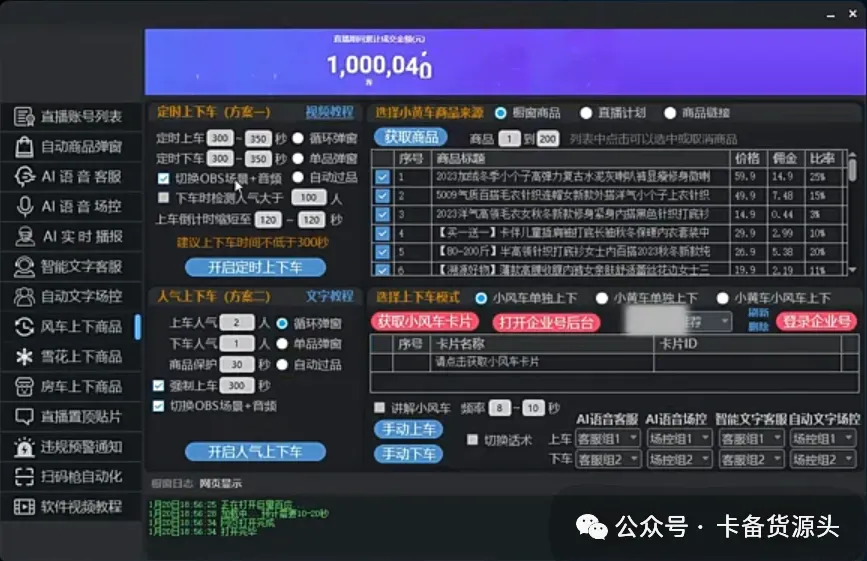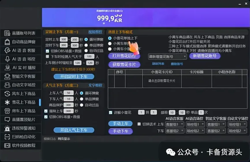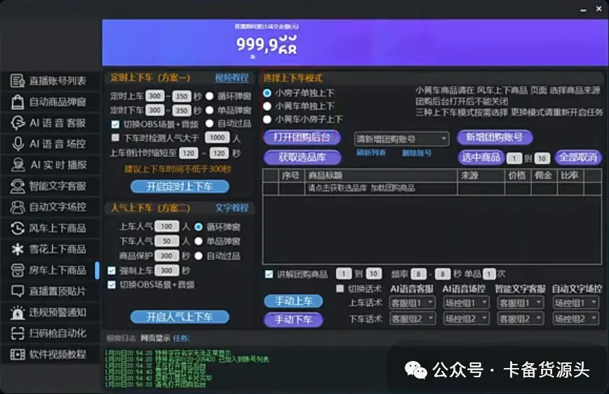 可自动或手动上下商品,支持定时和人气上下车,能切换OBS场景+音频,并设置不同话术和关键词回复。