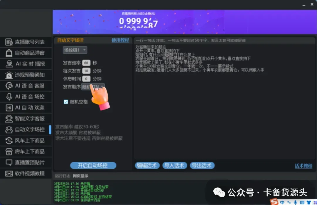 自动文字场控可设置多组,每组十条话术,支持自助编辑。编辑完成后即可开启!