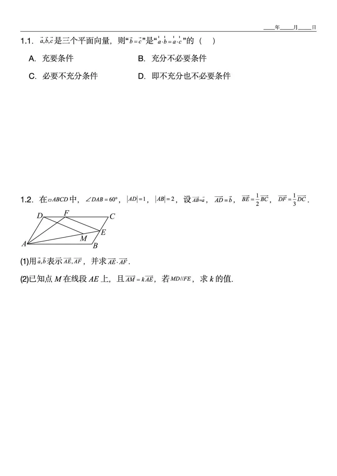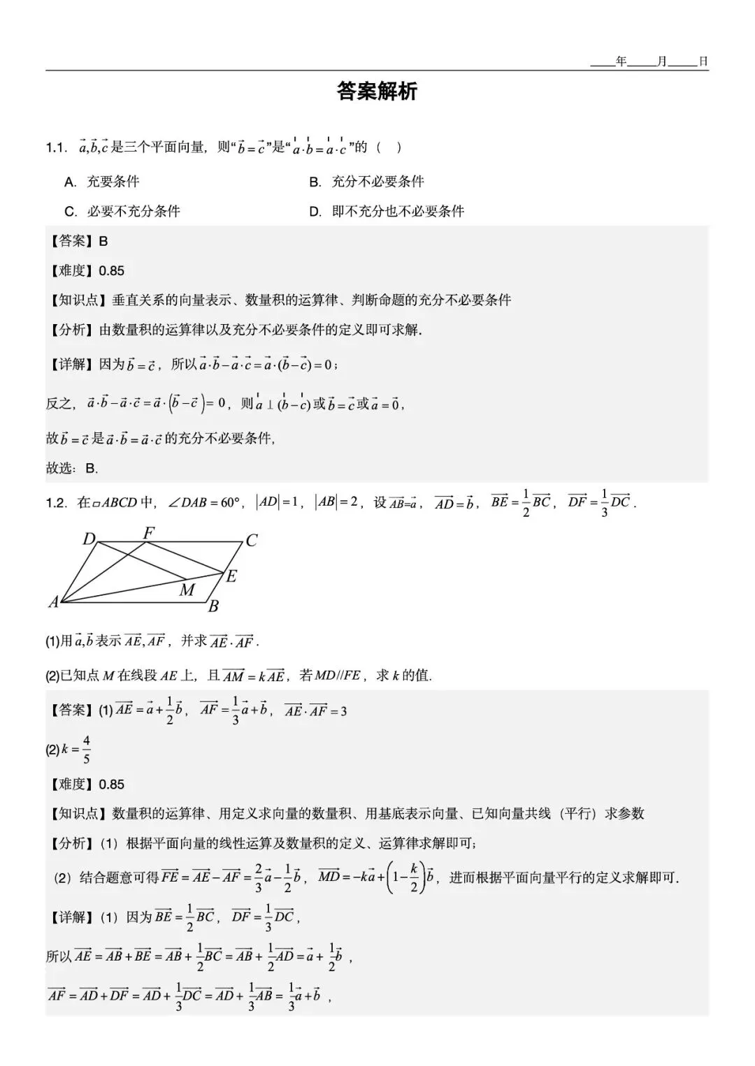 题1.1 判断充分必要条件,特别标注学生易混淆的“向量垂直→数量积为零”反推不成立 -