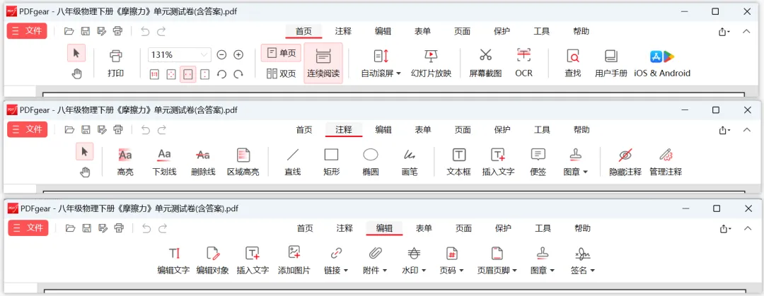 PDF编辑:虽然这个工具是免费的,但是他的编辑功能绝不比付费的软件少,而且很多在其他软件收费的功能,在这个软件上完全免费,比如高亮、批注、添加文字、插页眉页脚、页面顺序调整等等功能。
