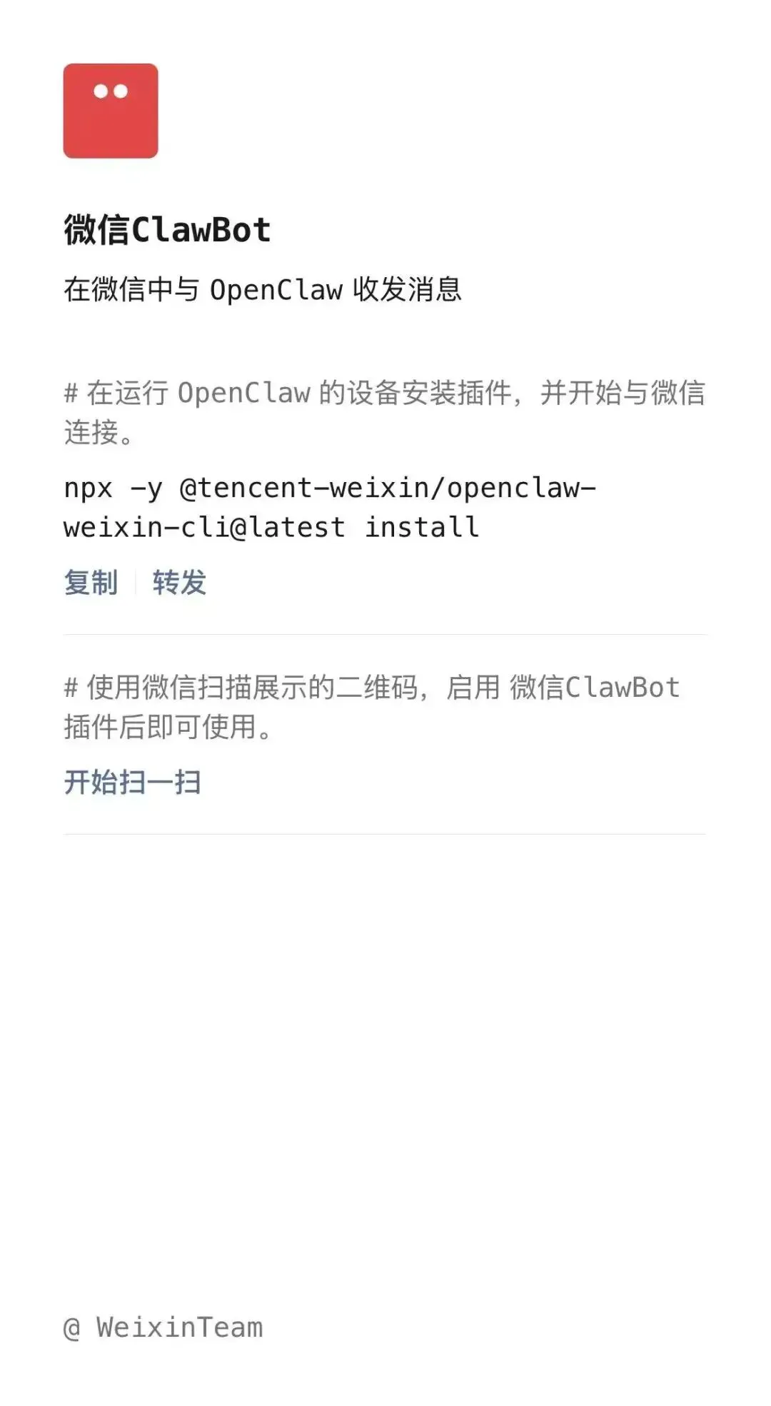 npx -y @tencent-weixin/openclaw-weixin-cli@latest install