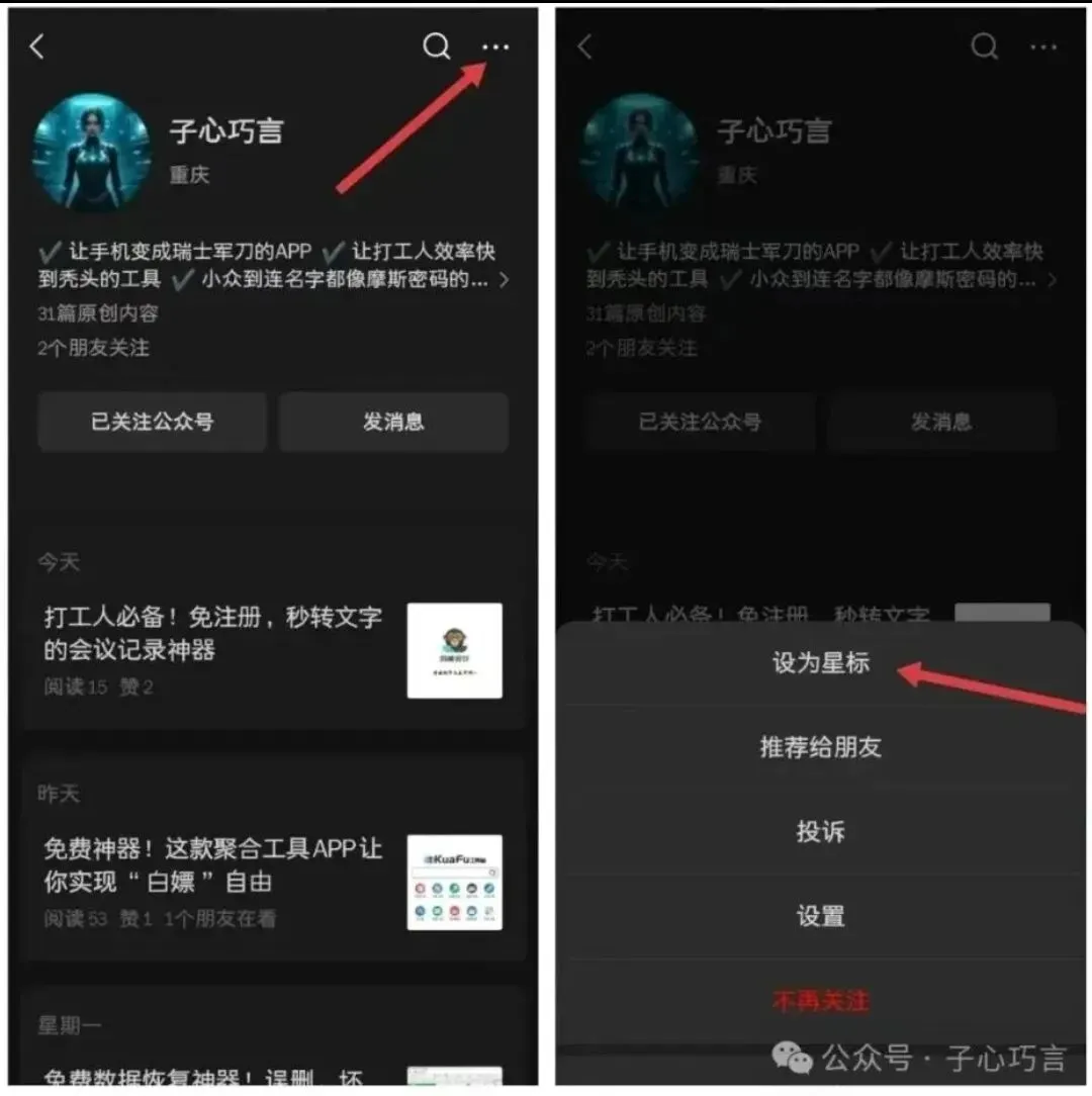 小伙伴们注意:获取神器请发文章结尾对应的关键词获取,子心每天不定时推送;但因信息流乱序,不少人还是错过了干货!子心建议大家把本公众号置顶(设为星标),以便第一时间看到推送,方法如下图: