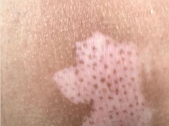 这些小黑点通常先从毛囊周围“长出来”,然后逐渐增多、变大、相互融合,慢慢覆盖白斑区域。