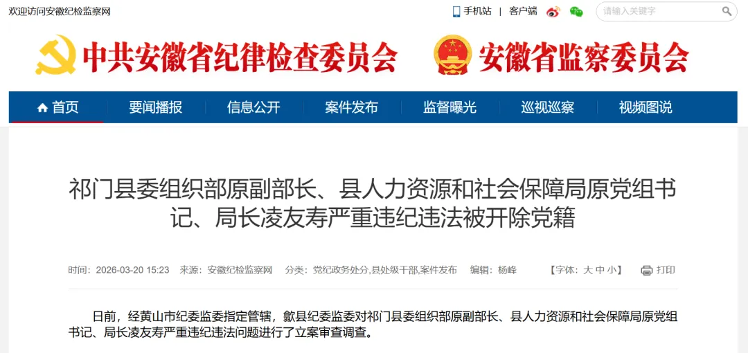 祁门县委组织部原副部长、县人力资源和社会保障局原党组书记、局长凌友寿被开除党籍