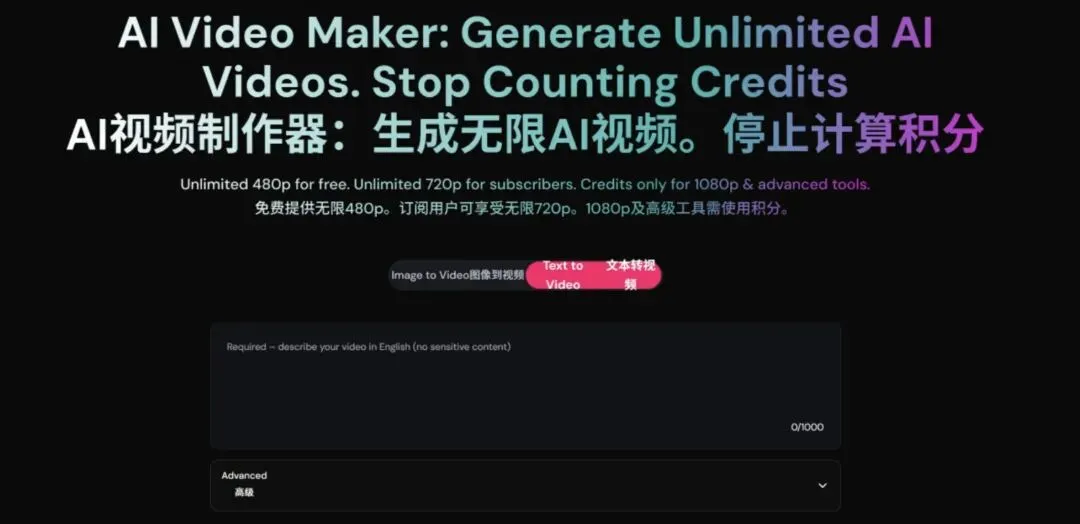 今天,我要分享一个完全“反内卷”的AI视频生成网站——AI Video Maker。它的口号简单直接:“停止计算积分,无限生成AI视频。”