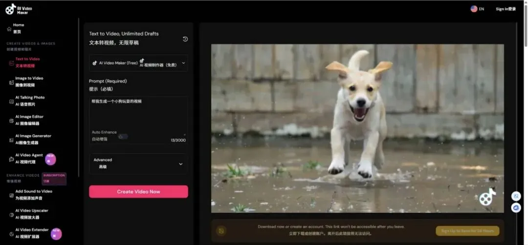 不需要注册账号,不需要绑定手机,更不需要提前充值。打开网站,输入你的创意想法,点击生成,视频就来了。