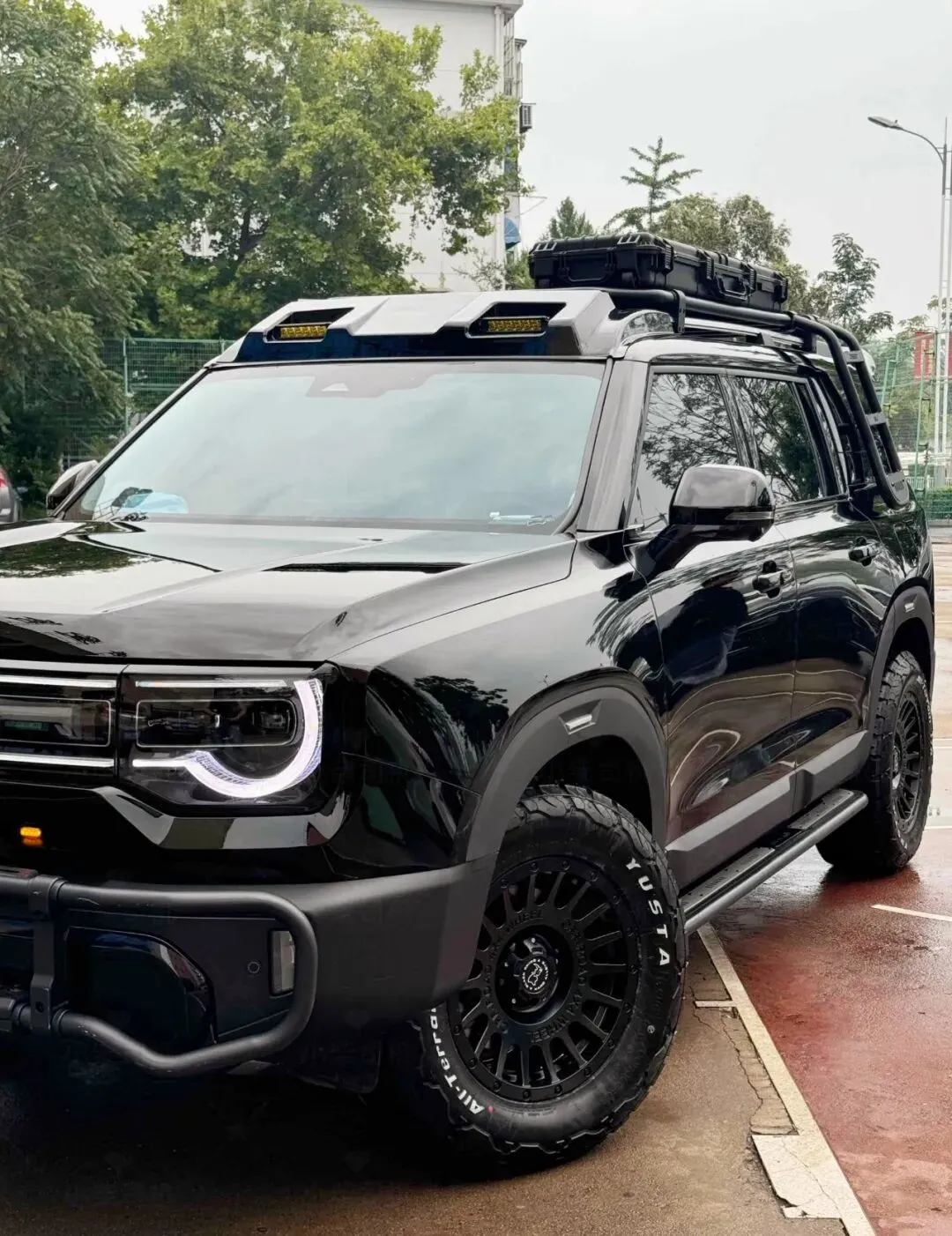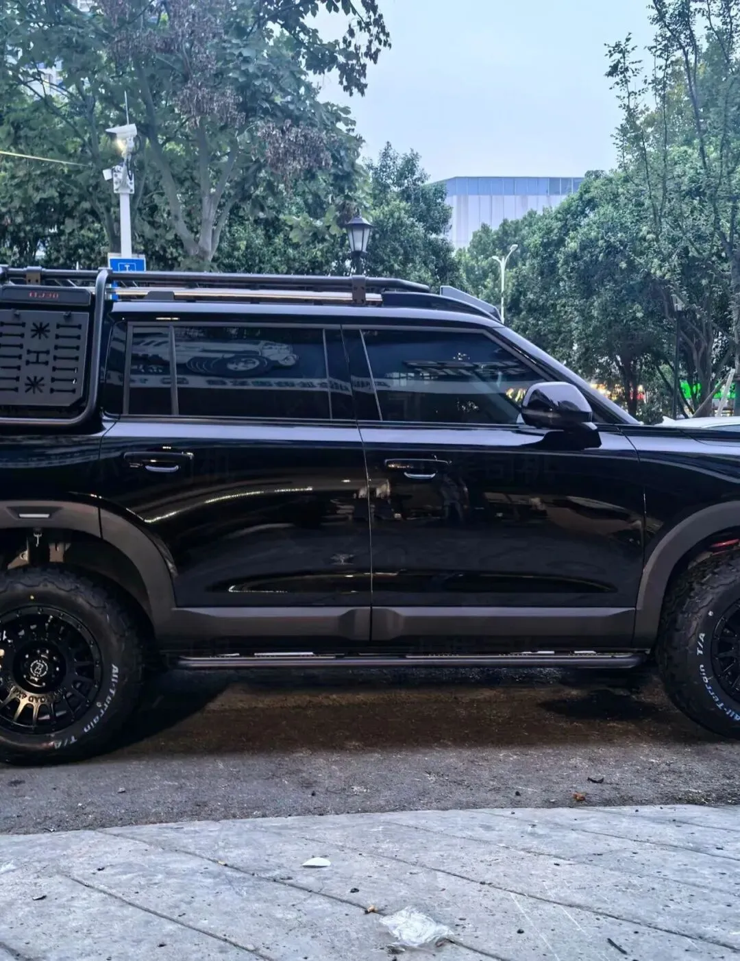 改装也简单弄了下,行李架、爬梯、踏板都是4S店送的,超省心!自己改了减震、轮胎和轮毂,还把车贴成了黑色,颜值直接拉满。