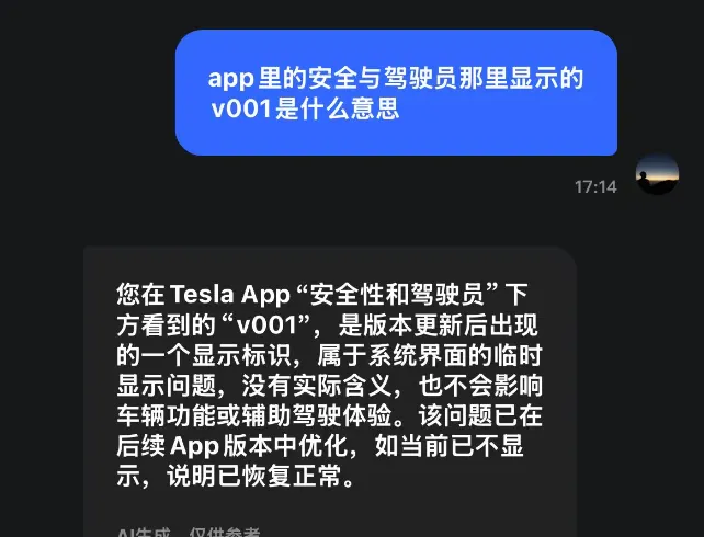 针对这个问题,我其实也有问过app里的官方客服,客服的回应是:您在Tesla App“安全性和驾驶员”下方看到的“v001”,是版本更新后出现的一个显示标识,属于系统界面的临时显示问题,没有实际含义,也不会影响车辆功能或辅助驾驶体验。该问题已在后续App版本中优化,如当前已不显示,说明已恢复正常