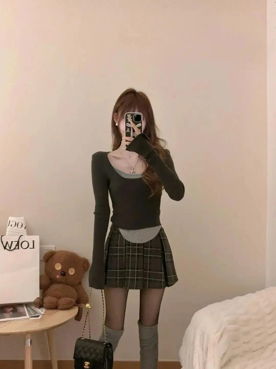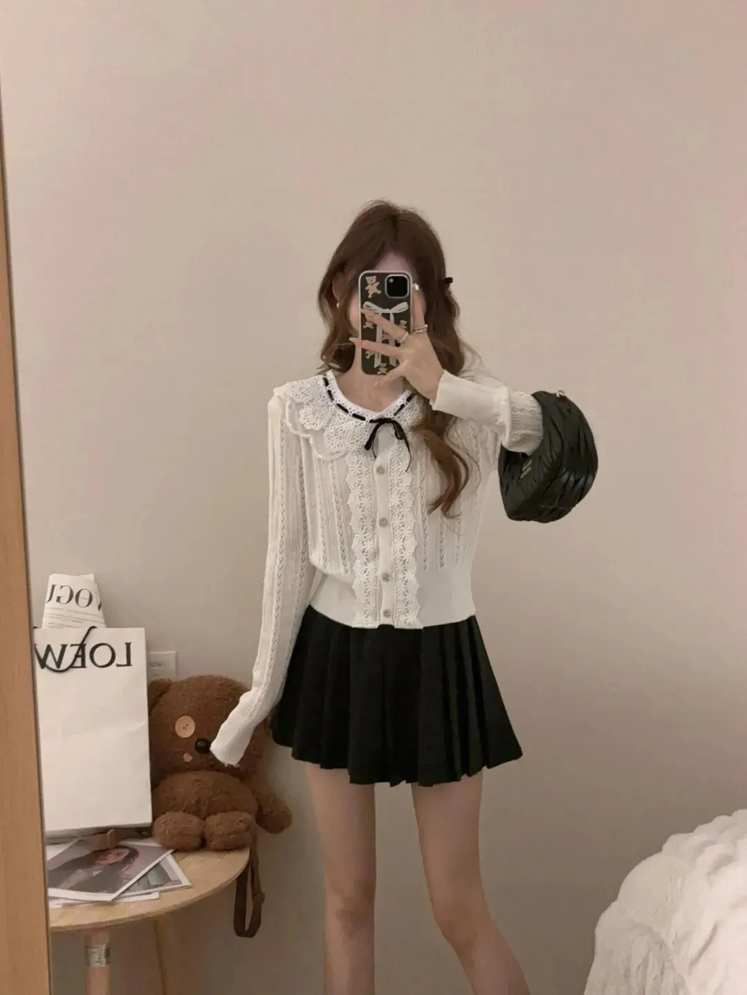 第一套是甜妹氛围感:白色蕾丝领针织开衫,大翻领蕾丝与蝴蝶结点缀细节,镂空针织自带温柔滤镜,搭配黑色百褶短裙,把少女感与精致感拉满,甜而不腻,温柔又灵动。第二套是复古辣妹风:深绿色方领褶皱上衣,方领设计勾勒肩颈线条,褶皱收腰凸显腰线,搭配红黑格纹半裙,复古撞色碰撞出叛逆感,把辣妹风刻在骨子里。第三套是纯欲天花板:同色系方领上衣搭配黑色百褶裙与黑丝,修身剪裁勾勒曲线,纯欲感拉满,简约中透着性感,轻松拿捏氛围感。第四套是叠穿小心机:深绿色方领上衣叠穿灰色内搭,搭配灰格纹百褶裙,假两件设计打造层次感,同色系穿搭高级感十足,休闲又显瘦。第五套是韩系学院风:米白色绞花毛衣,小马标刺绣点缀细节,绞花纹理自带复古感,搭配深绿百褶裙,温柔中透着青春气息,把韩系松弛感拿捏得恰到好处