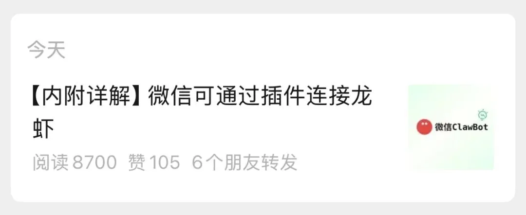 微信推出了微信 ClawBot 插件能力:连接后你可以通过微信聊天的方式,连接自己的龙虾。