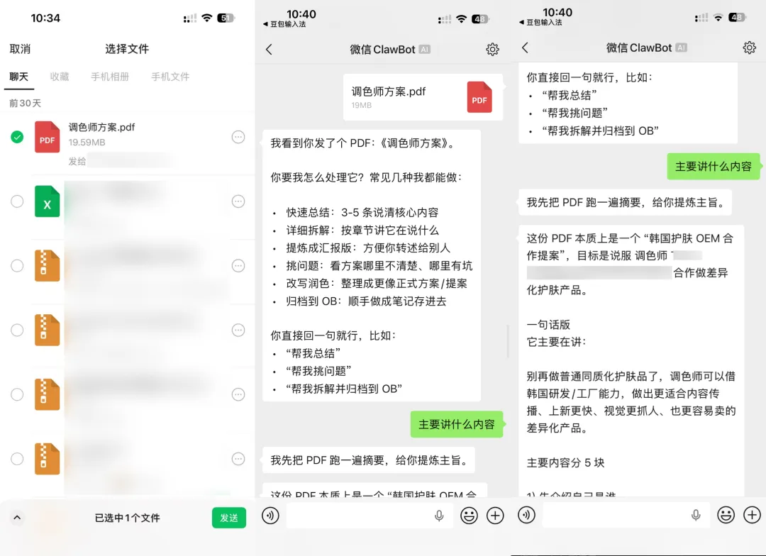 直接在微信「文件」里找到 PDF,发送给 ClawBot,龙虾秒读秒解。不打断心流,点一点就完成。