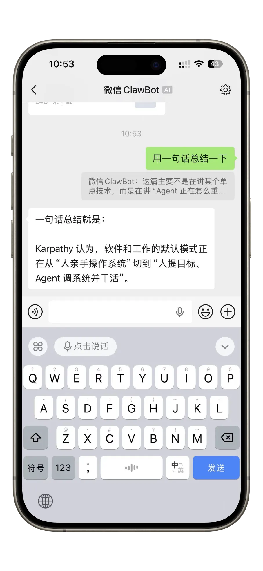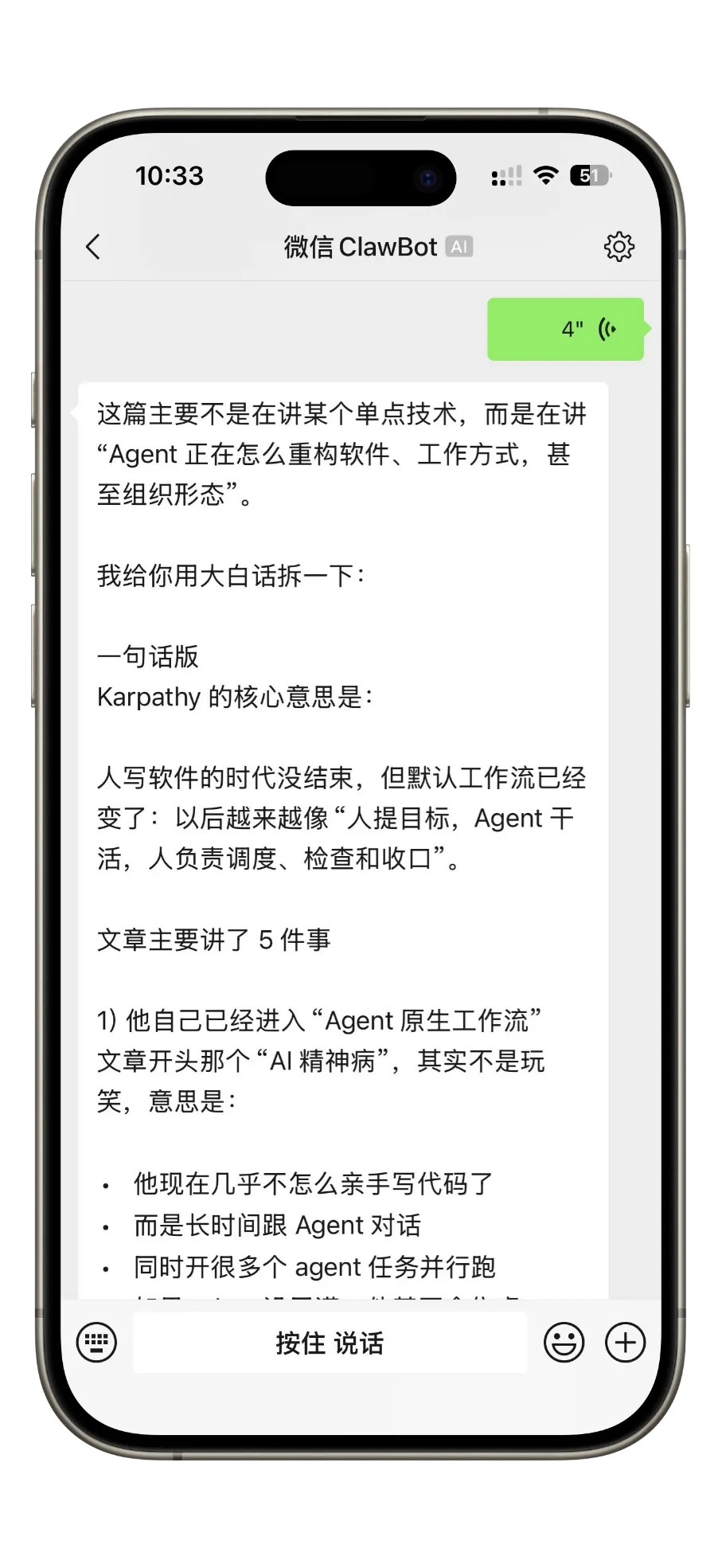 现在微信自带语音,按住说话就行,口喷很爽,有人味了,龙虾直接听懂、直接回复,零门槛