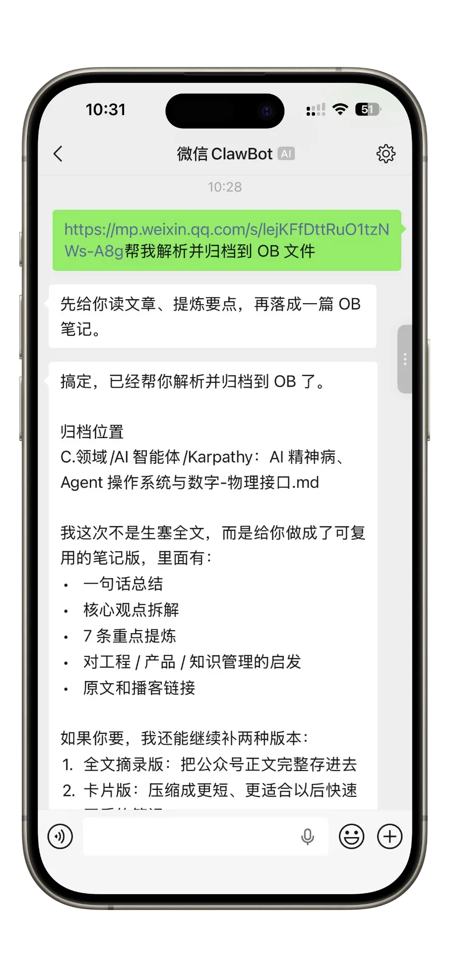 复制文章链接发给 ClawBot(目前还不支持直接转发),龙虾自动读文章、提炼要点、归档成结构化笔记。
