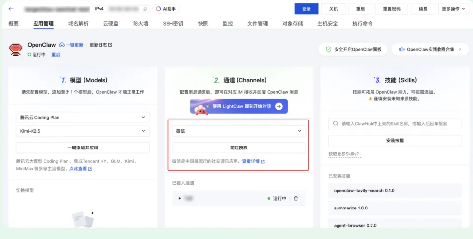 腾讯云控制台→Lighthouse实例→应用管理→一键更新到最新版→微信通道→扫码直连
