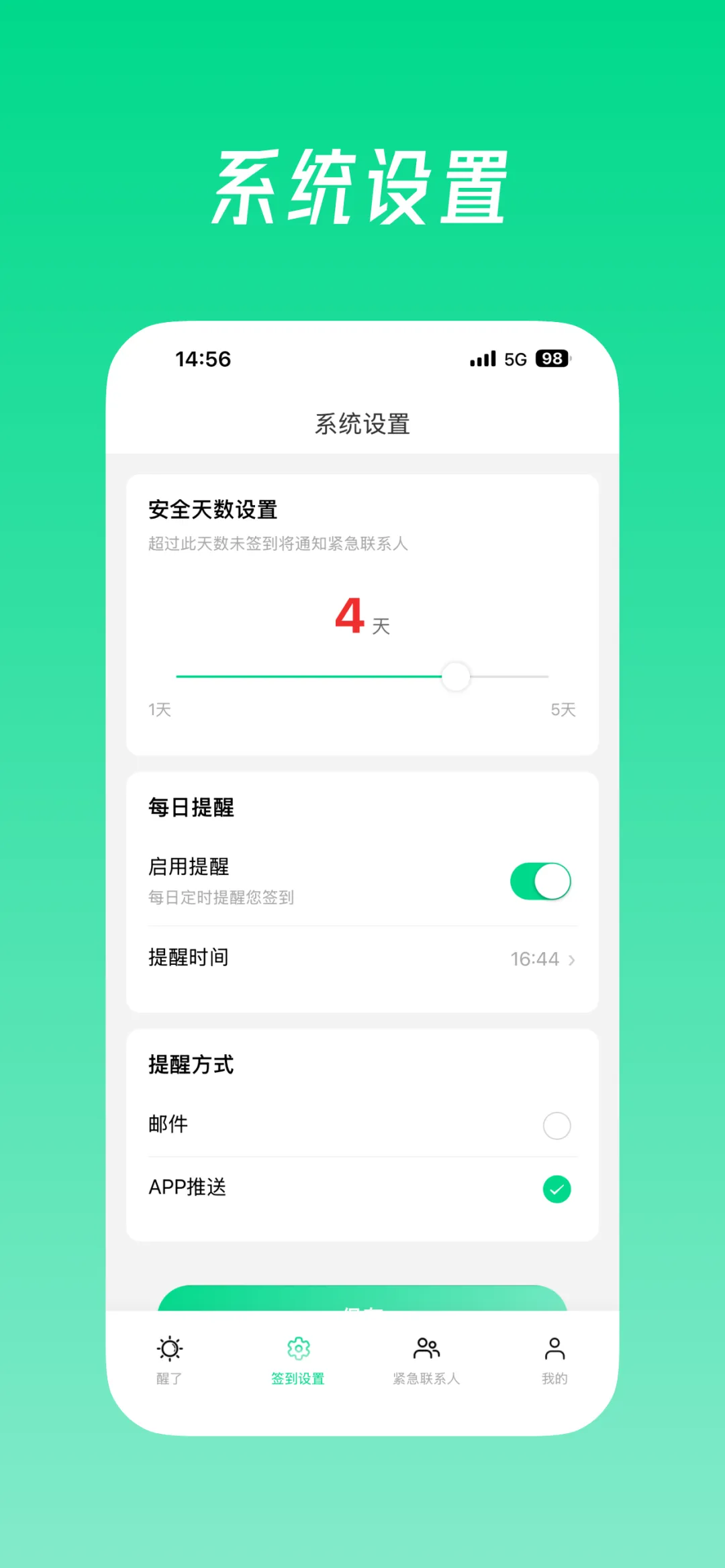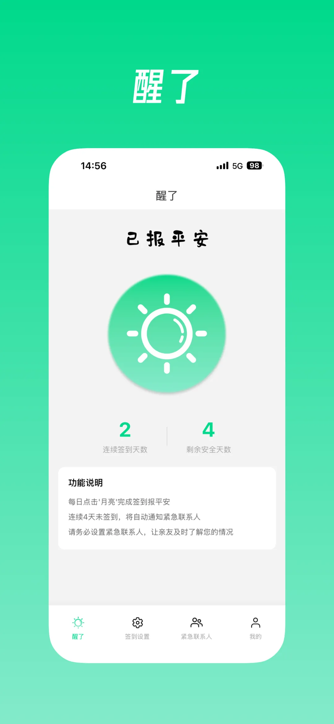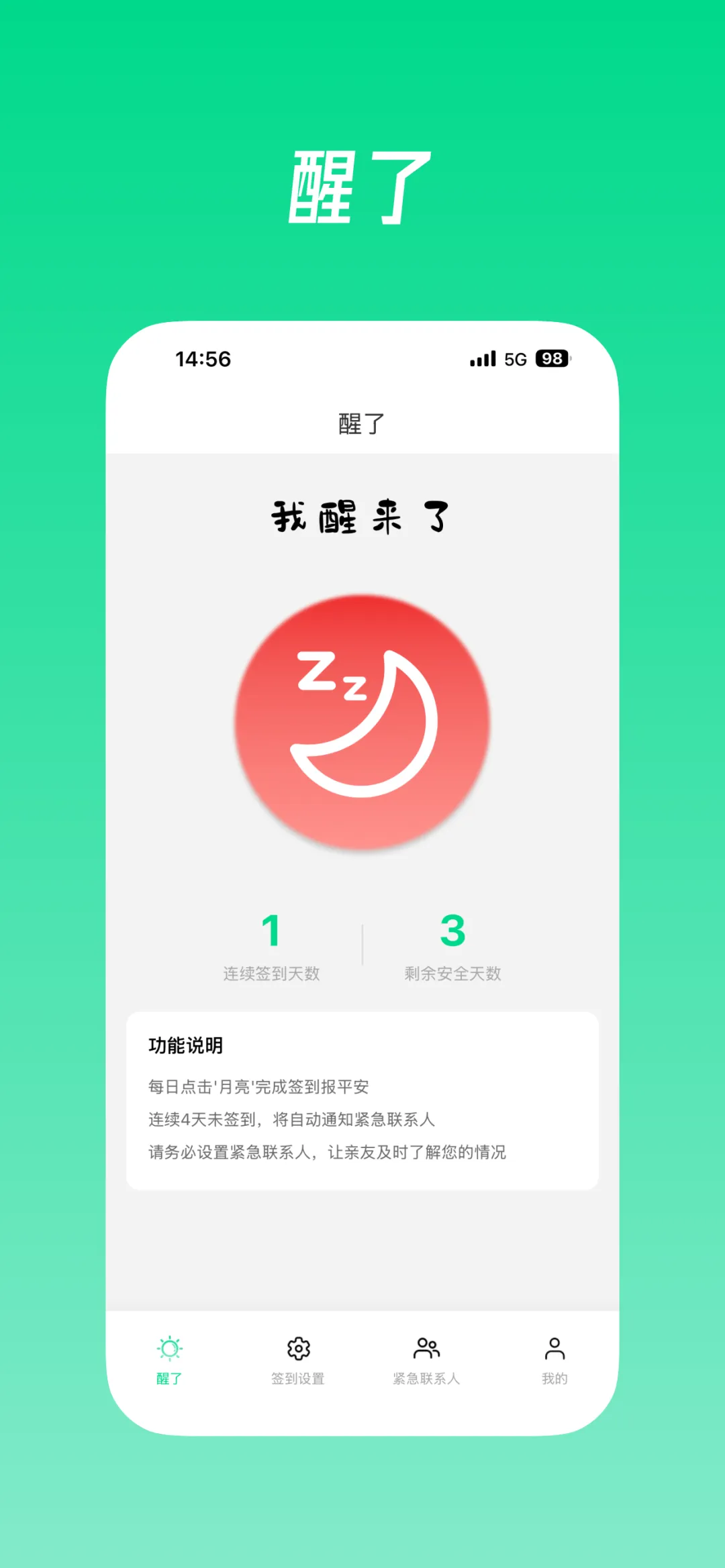 “醒了”APP今天正式发布! 「醒了」APP,今天正式发布了! “醒了”——最简单的牵挂,最聪明的守护。 独居的安心,源于一份随时在场的守护。我们为您打造了一位无声的守护者,将智能签到融入生活节奏,将紧急联络化为本能反应。 「醒了」APP,是一款专为独居者设计的日常关怀应用。 核心功能—— 每日签到 :轻松一键,每天醒来时点亮一次“小太阳”图标,记录每日醒了时刻,用最简单的方式,给家人报平安。 醒了: 轻松点亮: 智能提醒:支持设置每日定时提醒(可选择APP推送或邮件) 情感连接:自定义设置安全天数,在用户设定天数未打卡的第二天,系统自动发送消息通知预先设置好的紧急联系人,提示关注,为你筑造最聪明的守护。 预设紧急联系人: 联系人收到通知: 限时免费下载,快来体验吧! 扫码下载「醒了」APP,一起开启“最简单的牵挂,最聪明的守护”!!!