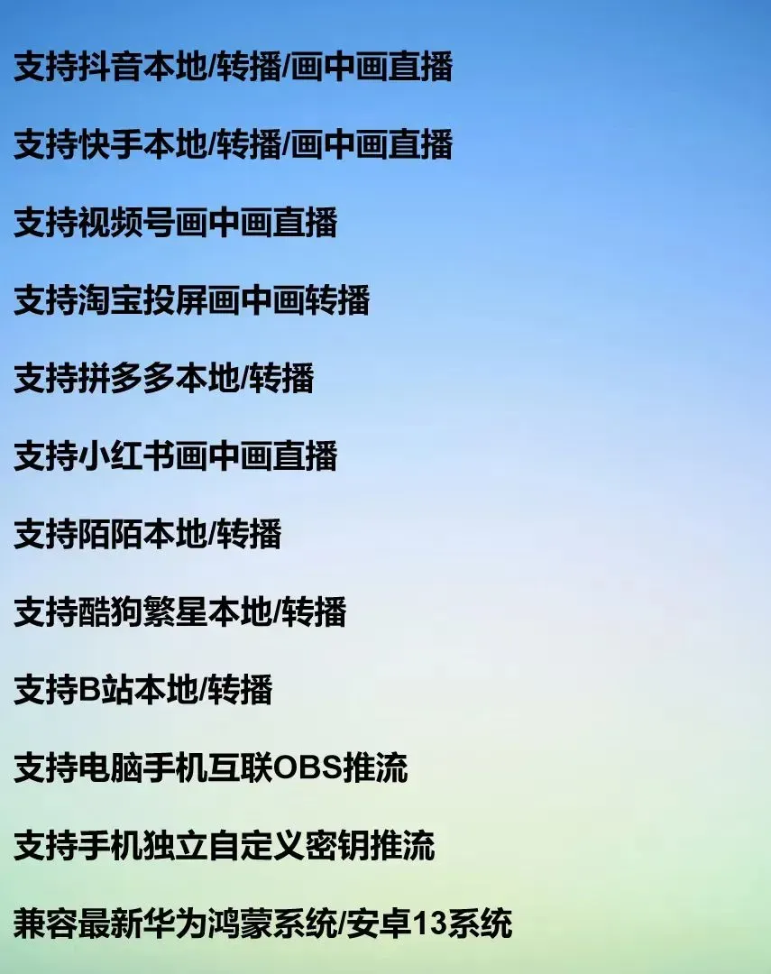 是一款专为无人直播设计的,多功能智能手机应用,支持录播、转播和虚拟主播直播,适用于带货、娱乐等多种场景。它兼容DY、KS、SPH等主流平台,提供本地直播、转播及画中画直播功能,支持手机密钥推流和OBS互联,确保直播稳定性。
