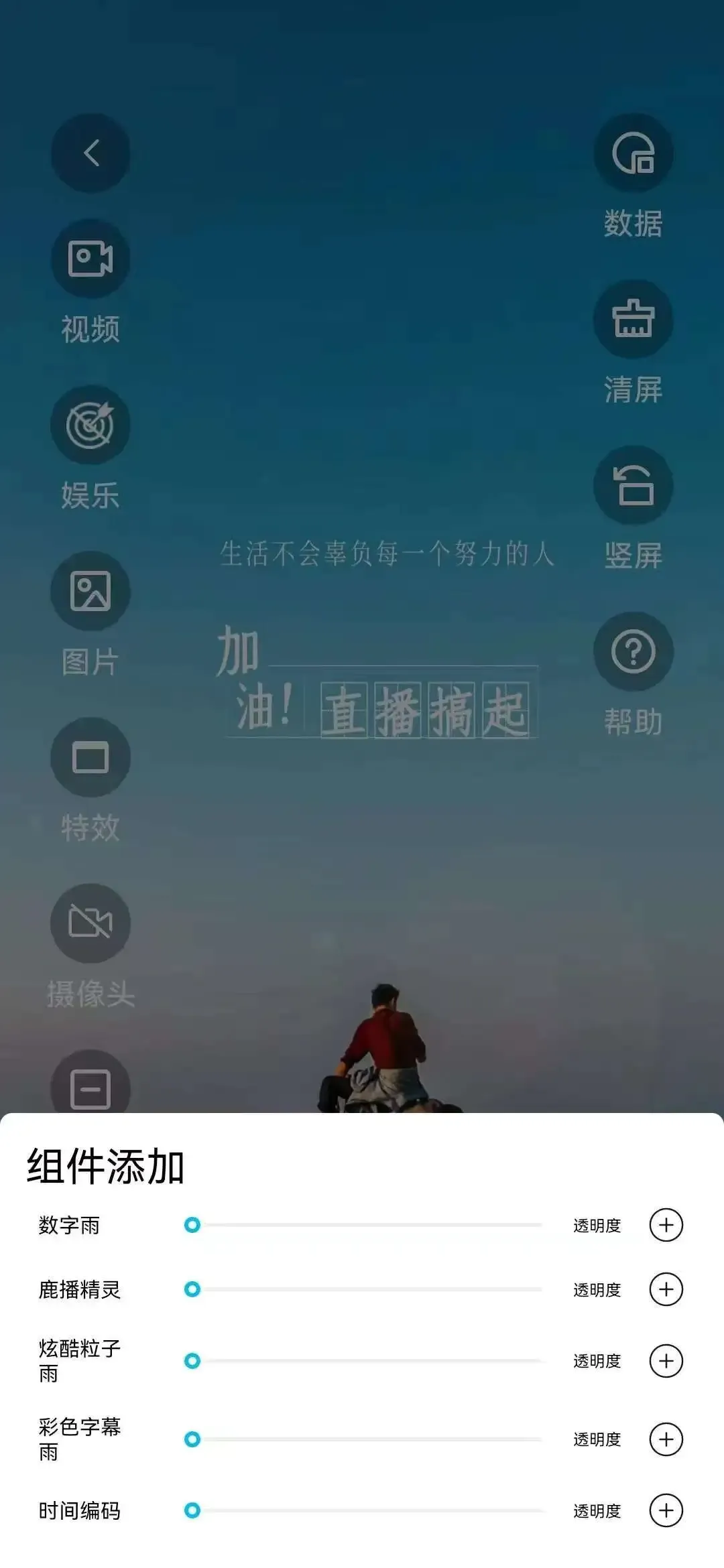 ●支持本地素材、网络视频、转播素材,新增数字人直播,可添加特效(数字雨、炫酷粒子雨、彩色字幕、时间编码)、摄像头、图片等等!