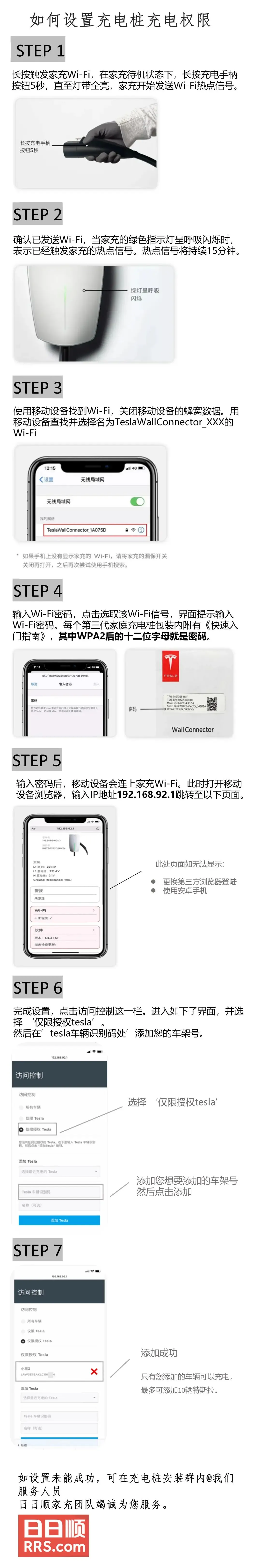 方法1:1.重启一下充电桩,手机关闭流量,打开wifi,搜索充电桩热点2.输入充电桩密码(说明书封面页小贴纸倒数第一行的大写字母就是)3.手机浏览器打开192.168.92.1跳转到调试页面4.访问控制选择所有车辆或者兼容模式方法21.苹果手机应用商店下载蓝色标志的tesla one app(安卓手机保存安装我给您发的安装包即可)2.选择外部合作伙伴3.输入手机号或者邮箱进行登录4.开始新的安装-扫描说明说二维码或者手动输入wifi的名称和密码(说明书首页倒数第一行大写字母是密码倒数第二行是桩名)