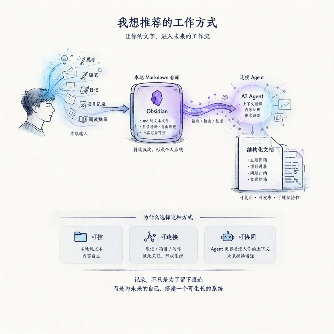 我想推荐的,是一种更适合这个时代的工作方式:把自己的内容尽量沉淀在可控、清晰、开放的本地文本仓库里,让记录不只服务于当下,也能够进入未来的工作流;让写下来的东西不只是存档,而能慢慢变成资产;让个人知识管理不只是“记了很多”,而是逐渐形成一个可以被连接、被调用、被协同的个人系统。