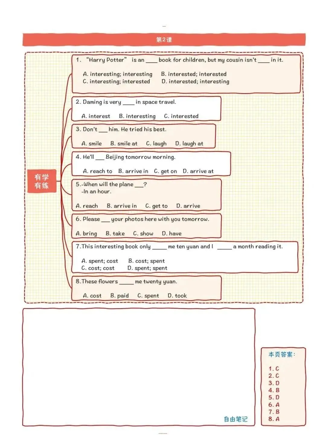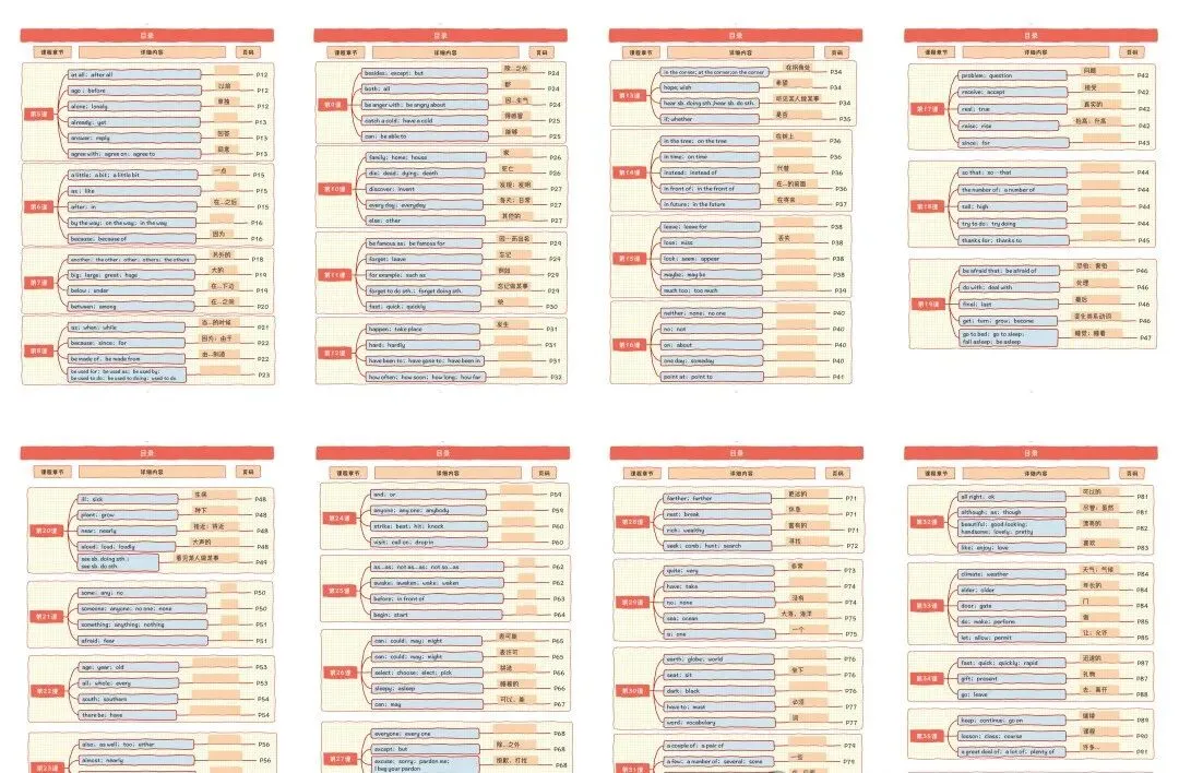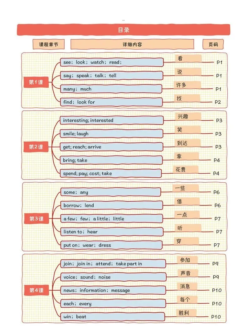 每课时围绕所学词汇,设置读音、释义、例句、练习四大模块,实现讲练一体化。全册共35课时,系统覆盖初中阶段所有易混淆词,确保学得清、记得牢。