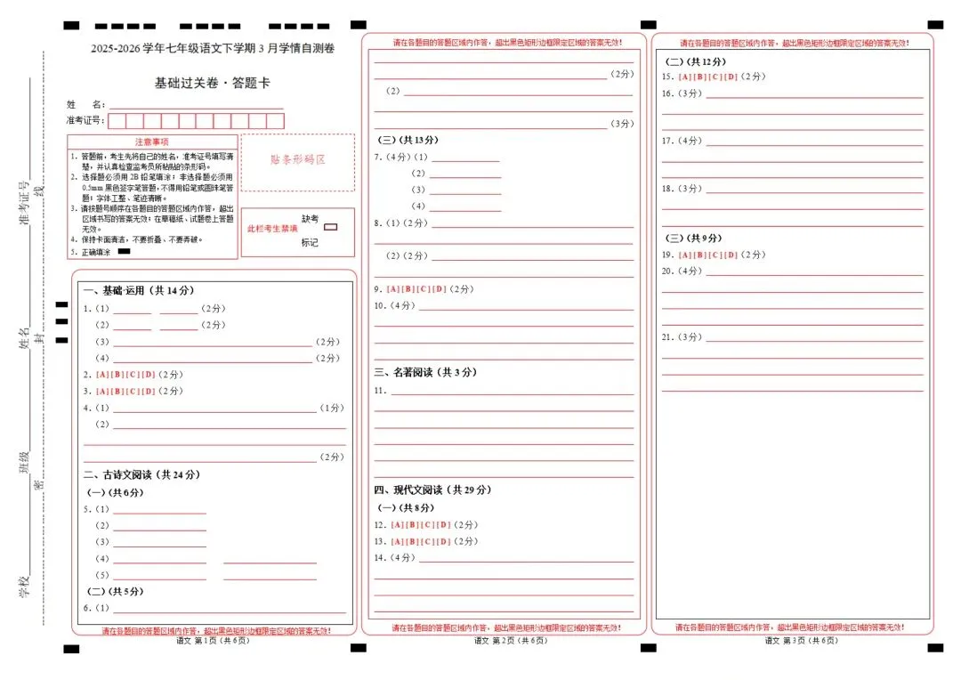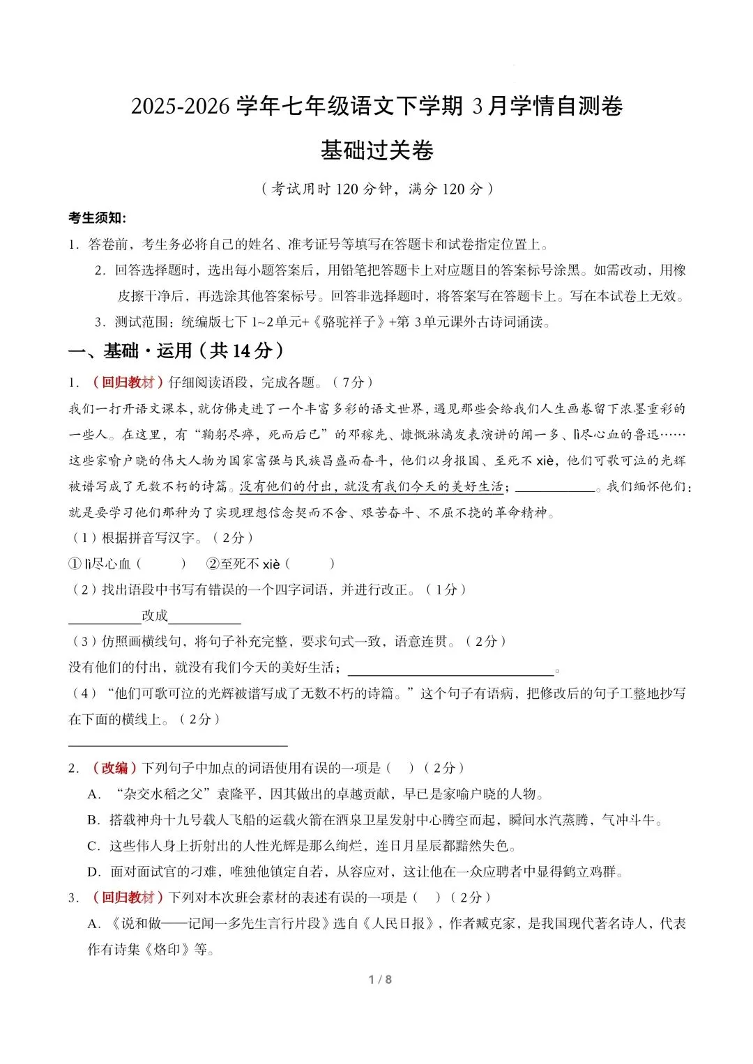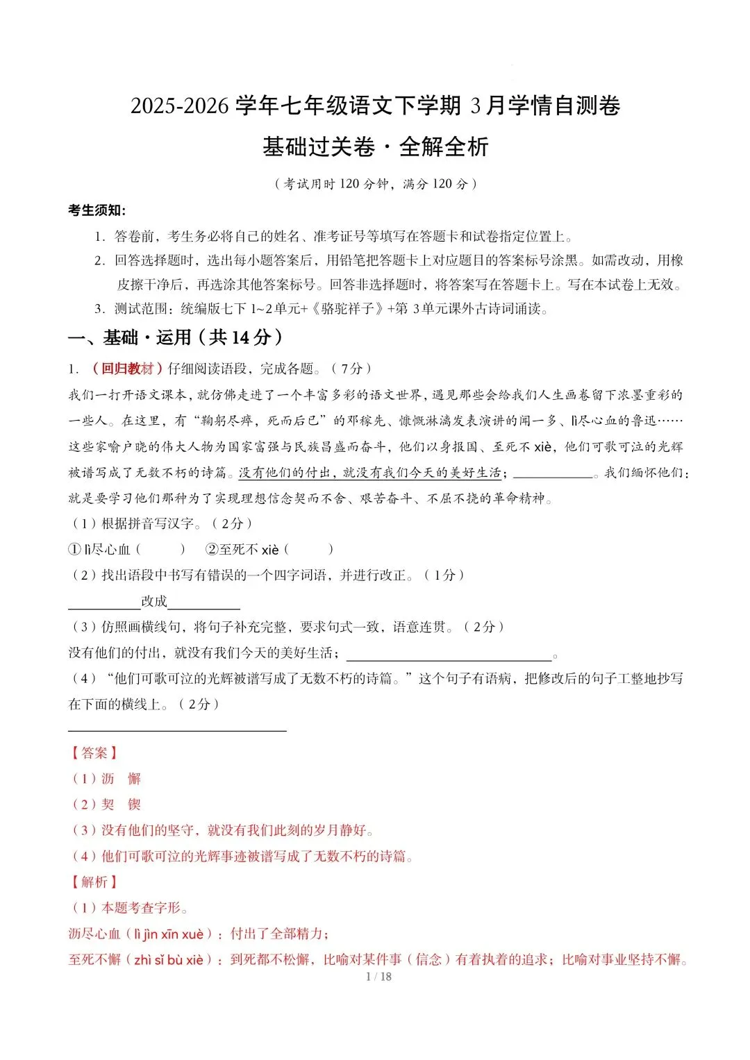 2026春新人教部编版七年级下册语文第一次月考测试卷(基础过关卷·含答题卡)电子版可打印。