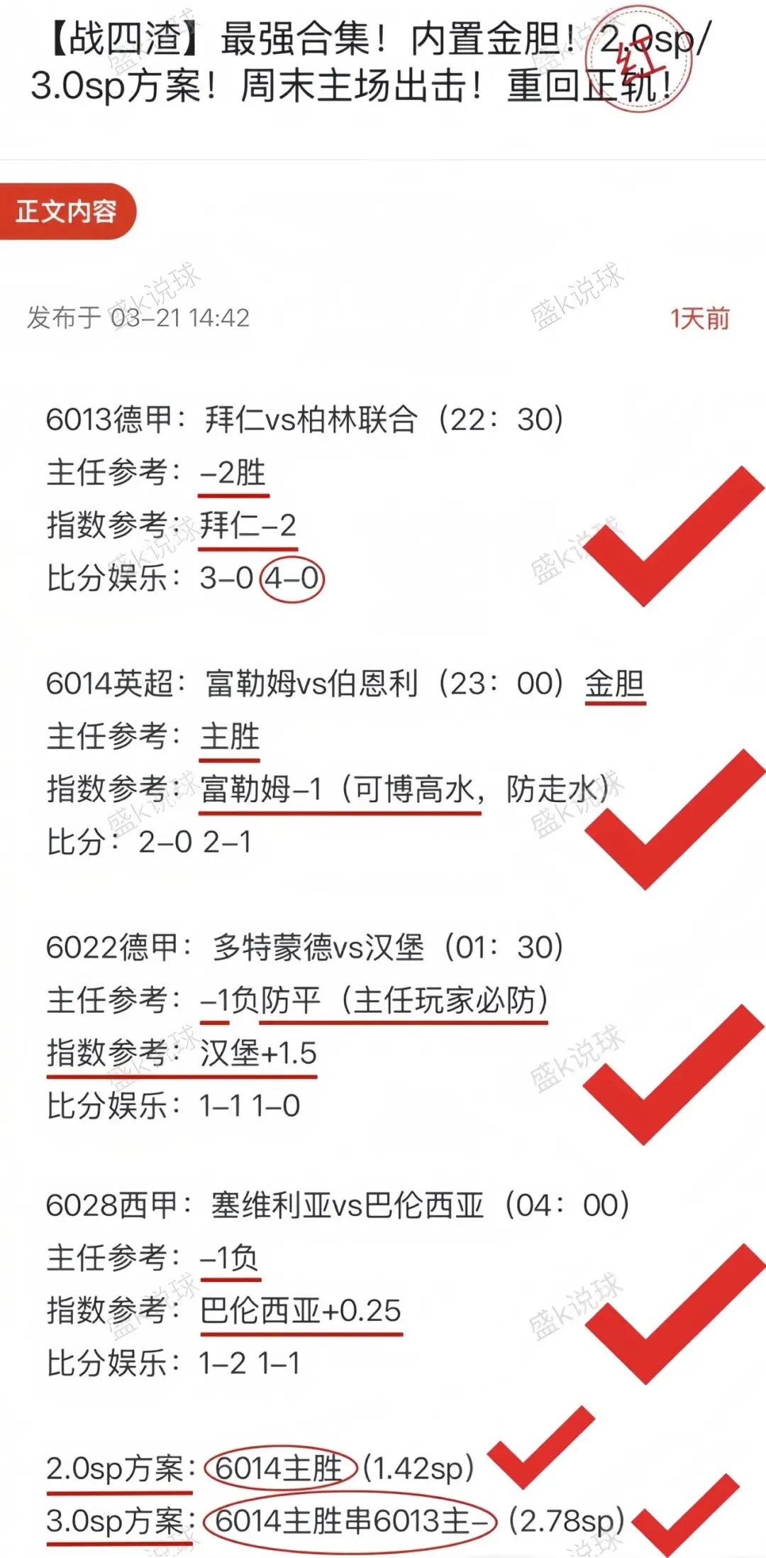 合集自从2018年世界杯开始,团队雨露均沾,历经8年风霜!每日雷打不动的更新,共计推荐过近5000场赛事。每1个自然年的综合胜率均能达到65%及以上的水准,其中合集内重心金胆场次更是高达90%及以上胜率,附带(重)字金胆胜率高达惊人的99%。咱们在状态好的时候能达到31日的日均产生至少1套全胜大满贯的战绩,并且就发生在2025年。过往依稀,依旧历历在目,改名合集“战四渣”的寓意十分简单,就是要将每日合集内的4场赛事统统精研到点。并且合集就是要打造一个长虹的趋势,合集内同样由大家喜爱的方向与比分推荐,每套合集内的五倍信心将作为金胆场次,同样保留传统的2.0sp/3.0sp方案建议,玩法极为丰富!团队永远会以真心相待,保持绝对忠诚,不辜负大家伙的每一次信任!
