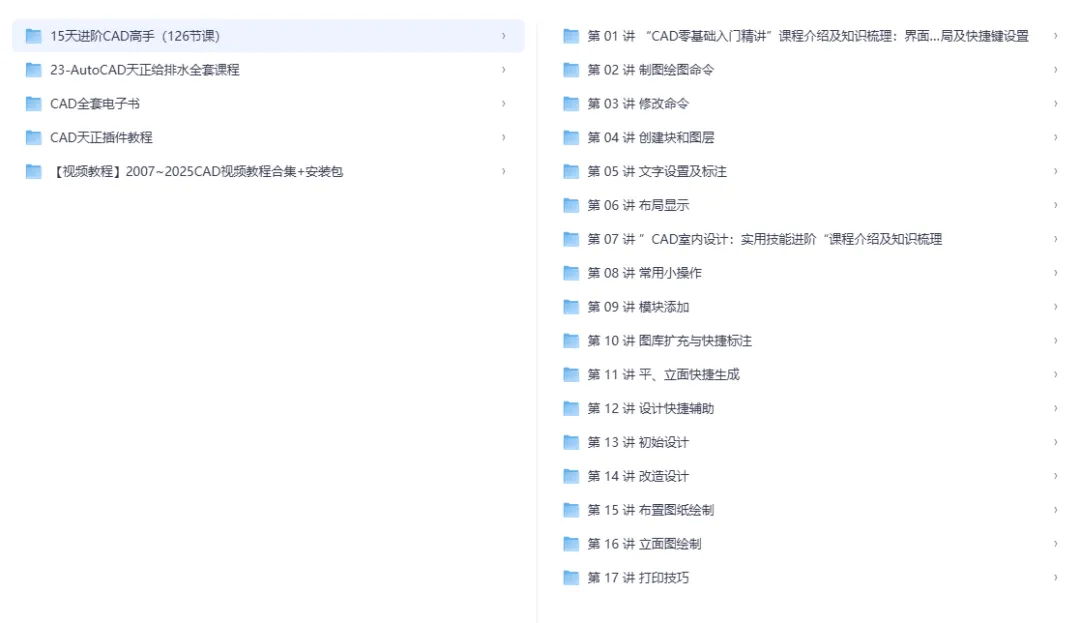 15天进阶CAD高手(126节课)系统的CAD进阶学习课程,共126节,涵盖从基础到室内设计进阶的全流程内容,具体课程目录: