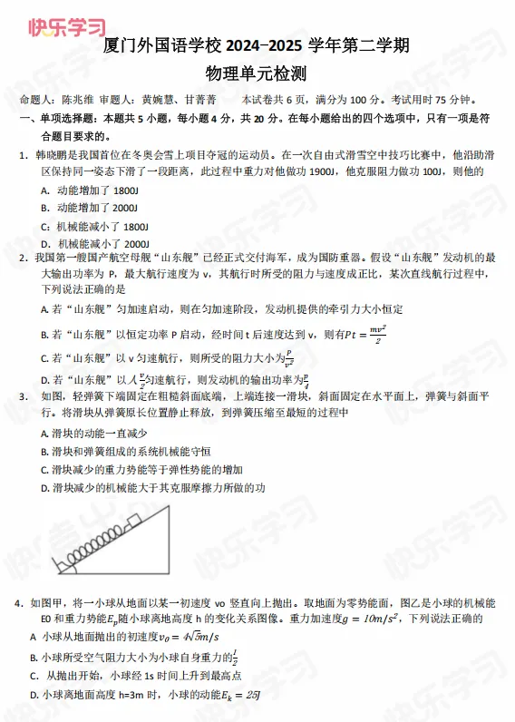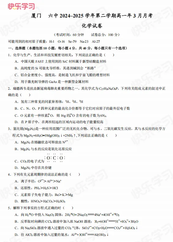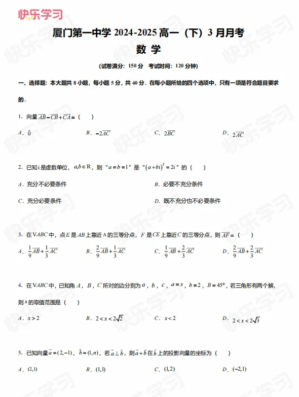 【试卷合集】厦门高一下学期第一次月考往年真题答案