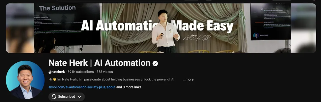 首先我是从去年6月开始真正接触AI,第一份学的就是Claude+Cursor+n8n,爬取RSS中的新闻,然而自那以后n8n关注的第一人就是他,Nate Herk, 油管近60万的关注,358篇视频教学,近95%的视频都是在介绍如何使用n8n!