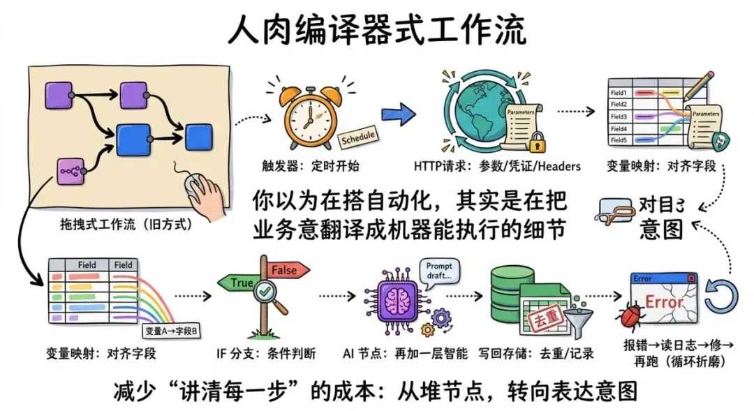 它当然是巨大的进步——在这些拖拽工具出现之前,没有开发能力的人几乎做不了任何自动化。但它有一个永远绕不开的成本:你必须亲手把每个步骤讲得足够具体。