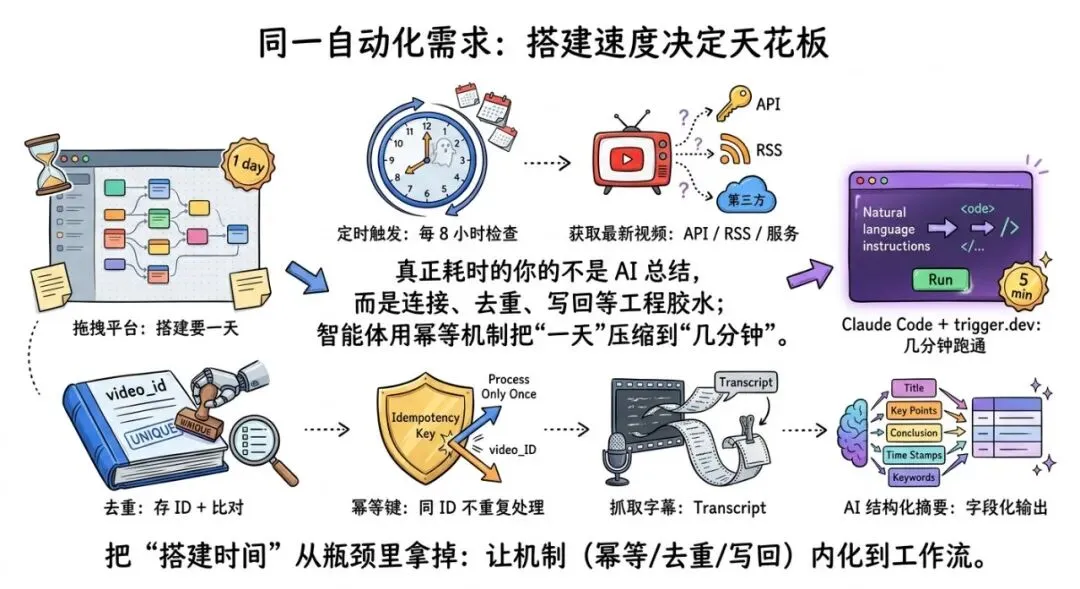 最让我震惊的不是“跑通”,而是去重这件事:在拖拽工具里你必须显式构建数据库和写回;而在智能体工作流里,它用幂等键(idempotency key)思路,直接把“同一个 video ID 不处理第二次”内化成机制。