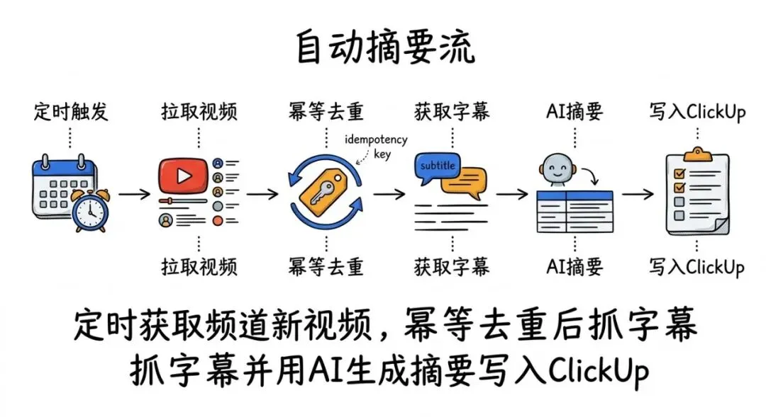 你得存 video ID你得有一个数据库/表格你得在每次运行前读取并比对如果是新视频:抓 transcript(字幕)prompt AI 输出结构化摘要写回 ClickUp写回 video ID 防止重复