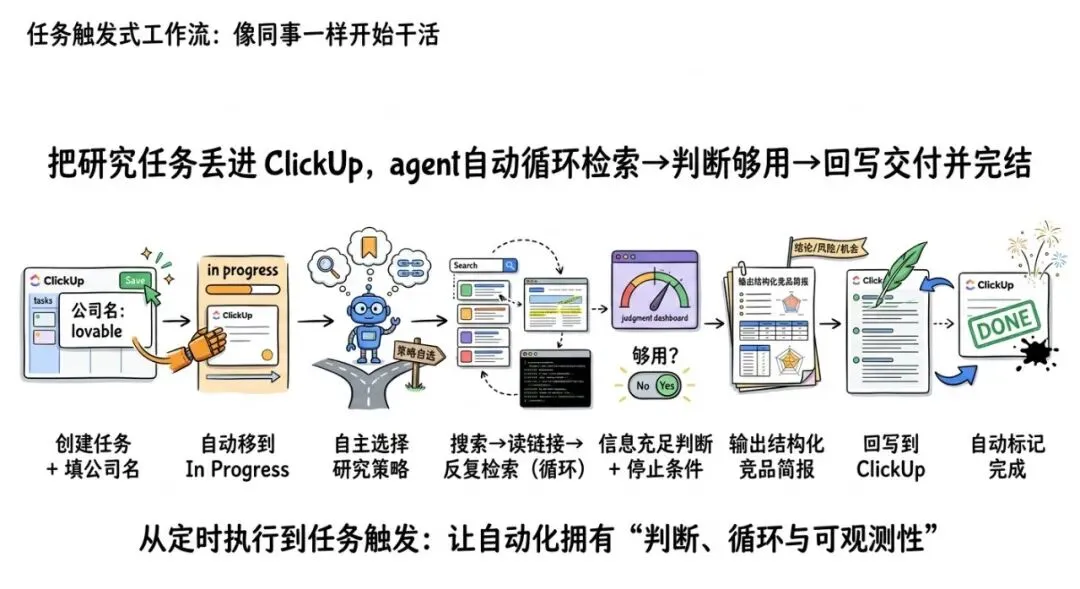 把任务移到 in progress(告诉你它在干活)自己决定研究策略(搜索、读链接、反复检索)判断信息“够用了”才停输出结构化竞品简报回写到 ClickUp,并把任务标记为完成