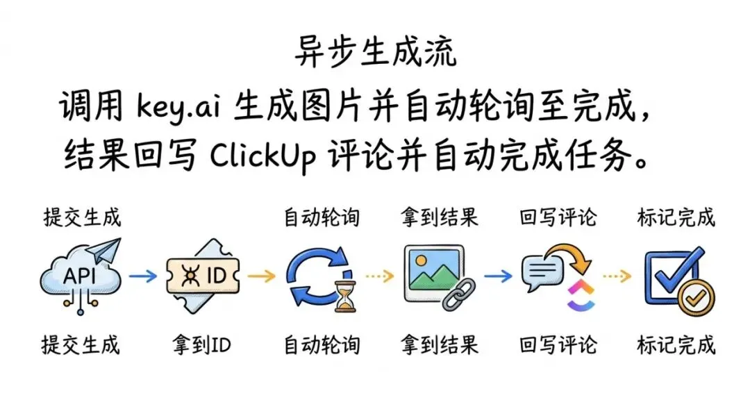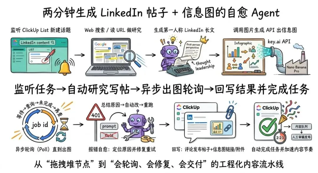 做研究(search web / read URL)生成第一人称 thought leadership 风格的 LinkedIn 帖子调用 Nano Banana Pro 之类的图片生成(通过 key.ai API)因为图片生成是异步的,它会自动轮询检查状态,直到完成最终把帖子 + 信息图链接/附件,以评论形式回写到 ClickUp完成后自动把任务标记 complete