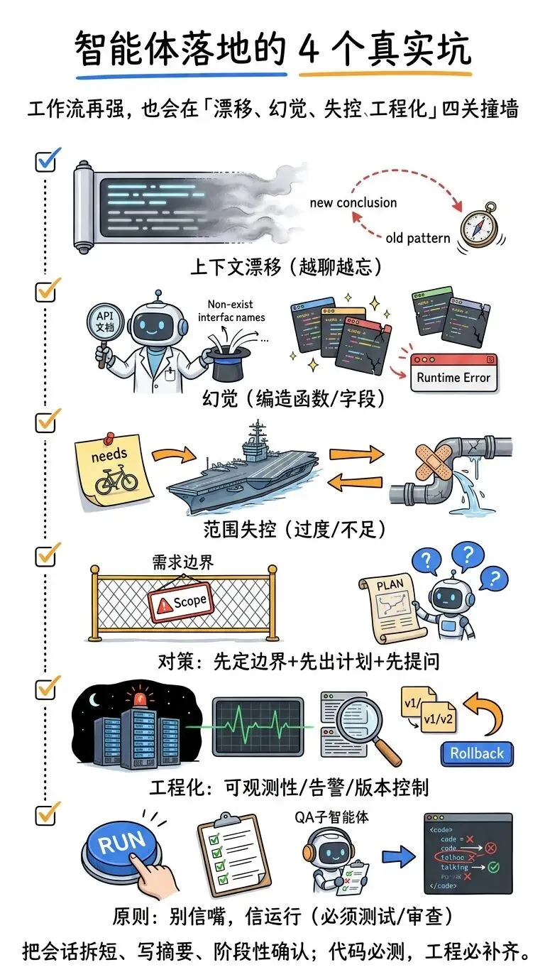 但作者在视频里也很诚实:智能体工作流强归强,落地会撞墙,主要是四类问题。