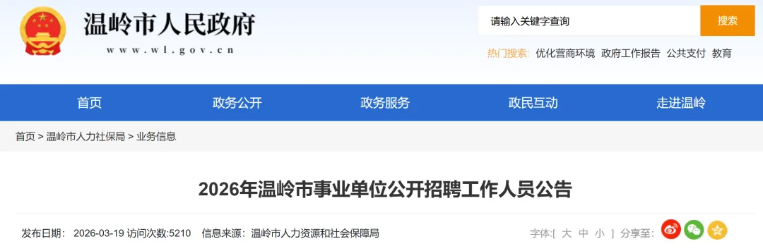 2026年温岭市事业单位计划公开招聘工作人员45名,具体的招聘单位、岗位、人数等详见《2026年温岭市事业单位公开招聘工作人员一览表》(附件)。可登录温岭市人力资源和社会保障局网(http://www.wl.gov.cn/col/col1551604/index.html)查询,该网站为发布本次公开招聘其他相关信息的指定平台。