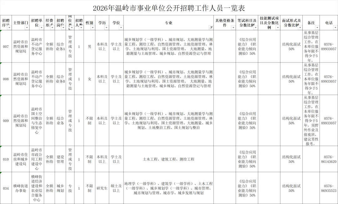 为满足全市事业单位补充工作人员需要,根据《事业单位公开招聘人员暂行规定》(人事部令第6号)、《中共中央组织部 人力资源社会保障部关于进一步做好事业单位公开招聘工作的通知》(人社部发〔2024〕57号)、《浙江省事业单位公开招聘人员暂行办法》(浙人才〔2007〕184号)《关于规范事业单位公开招聘工作的若干意见》(温市委办发〔2021〕18号)等文件规定,现将2026年温岭市事业单位公开招聘工作人员有关事项公告如下: