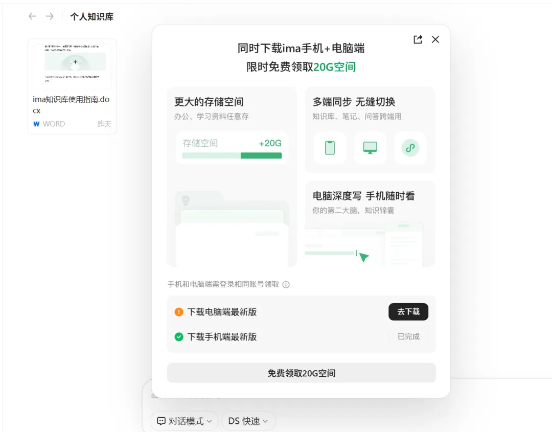 电脑端:访问 ima.qq.com 下载客户端 手机端:微信搜索「ima知识库」小程序