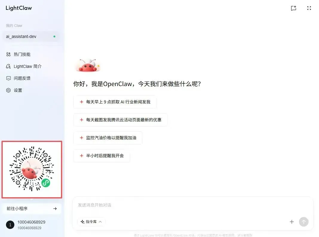 - 页面会跳转到LightClaw界面,左下角就是微信小程序码,用手机微信扫一扫,直接进入小程序。