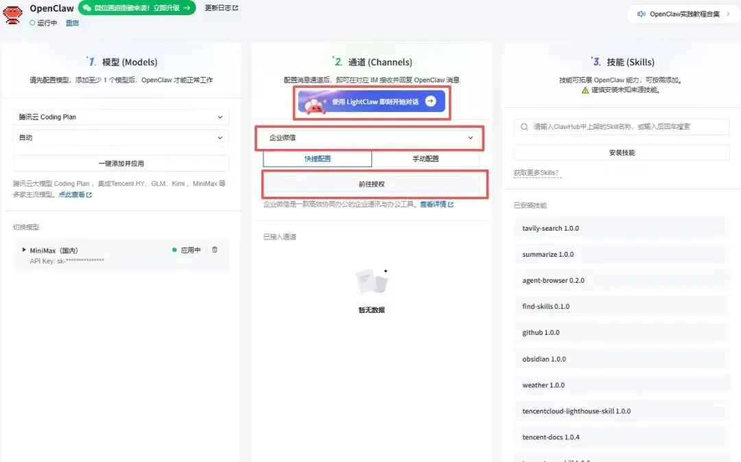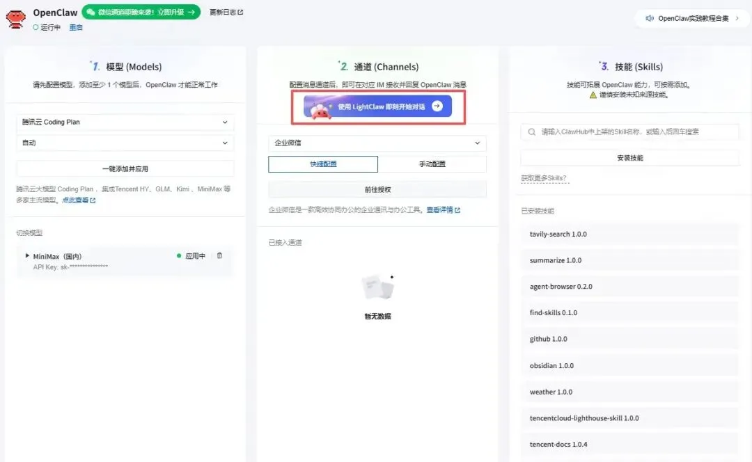 - 切换到「通道(Channels)」板块,直接点醒目的「使用LightClaw即刻开始对话」按钮,跳过复杂的企业微信配置。